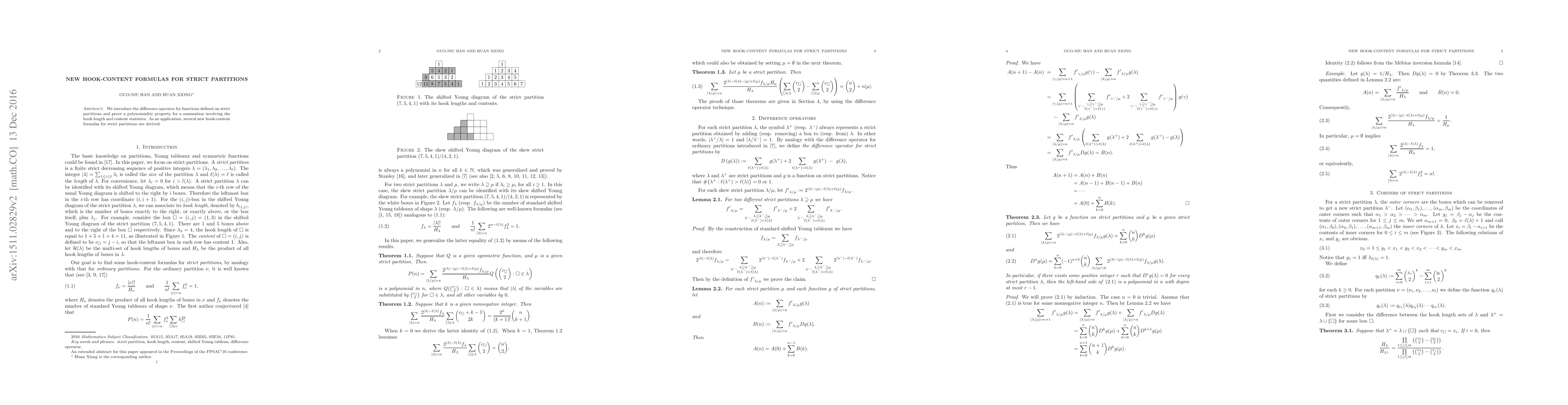 This paper presents a difference operator for strict partitions and establishes a polynomiality result for a summation of hook length and content statistics, leading to the derivation of new hook-content formulas for strict partitions.