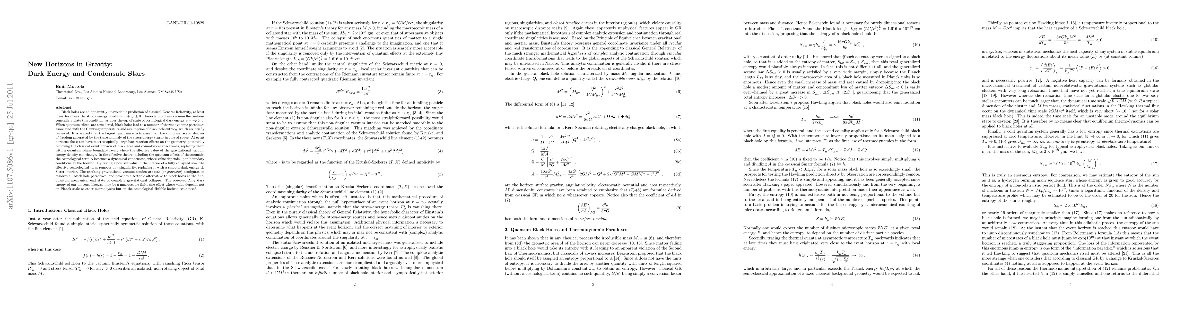 Black holes are an apparently unavoidable prediction of classical General Relativity, at least if matter obeys the strong energy condition rho + 3p > 0. However quantum vacuum fluctuations generally violate this condition, as does the eq. of state of cosmological dark energy. When quantum effects are considered, black holes lead to a number of thermodynamic paradoxes associated with the Hawking temperature and assumption of black hole entropy, which are briefly reviewed. It is argued that the largest quantum effects arise from the conformal scalar degrees of freedom generated by the trace anomaly of the stress-energy tensor in curved space. At event horizons these can have macroscopically large backreaction effects on the geometry, potentially removing the classical event horizon of black hole and cosmological spacetimes, replacing them with a quantum phase boundary layer, where the effective value of the gravitational vacuum energy density can change. In the effective theory including the quantum effects of the anomaly, the cosmological term becomes a dynamical condensate, whose value depends upon boundary conditions at the horizon. By taking a positive value in the interior of a fully collapsed star, the effective cosmological term removes any singularity, replacing it with a smooth dark energy de Sitter interior. The resulting gravitational vacuum condensate star (or gravastar) configuration resolves all black hole paradoxes, and provides a testable alternative to black holes as the final quantum mechanical end state of complete gravitational collapse. The observed dark energy of our universe likewise may be a macroscopic finite size effect whose value depends not on Planck scale or other microphysics but on the cosmological Hubble horizon scale itself.