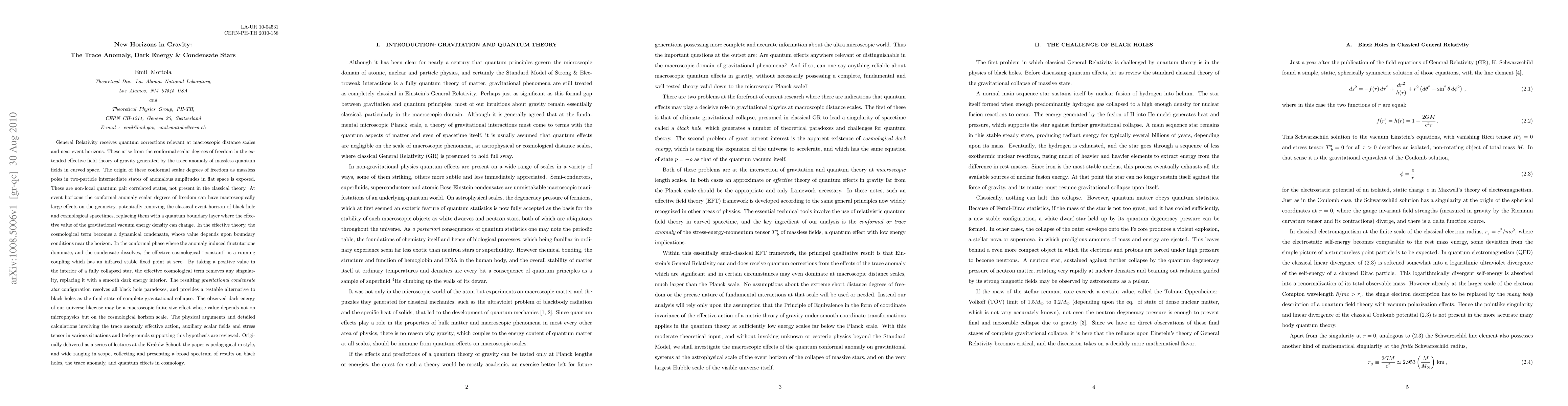 This paper explores quantum corrections to General Relativity arising from the trace anomaly of massless quantum fields, suggesting these corrections can replace classical event horizons with quantum boundary layers. It proposes a dynamical cosmological term and a gravitational condensate star model that resolves black hole singularities and offers a testable alternative to black holes.