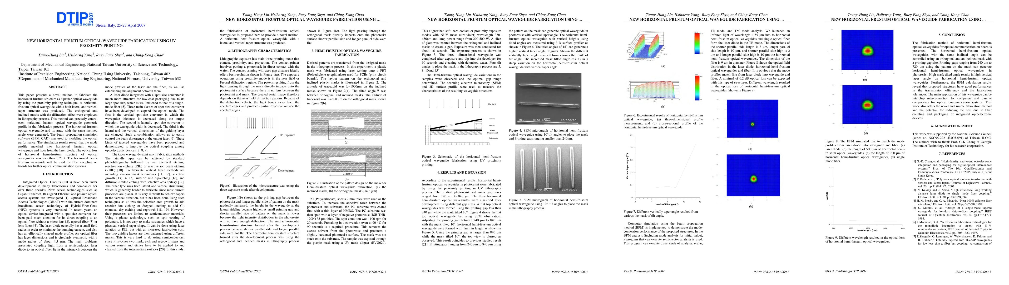 This paper presents a novel method to fabricate the horizontal frustum structure as a planar optical waveguide by using the proximity printing technique. A horizontal frustum optical waveguide with a both lateral and vertical taper structure was produced. The orthogonal and inclined masks with the diffraction effect were employed in lithography process. This method can precisely control each horizontal frustum optical waveguide geometric profile in the fabrication process. The horizontal frustum optical waveguide and its array with the same inclined angle were generated. The beam propagation simulation software (BPM_CAD) was used to modeling the optical performance. The simulation results reveal that the mode profile matched into horizontal frustum optical waveguide and fiber from the laser diode. The optical loss of horizontal hemi-frustum structure of optical waveguides was less than 0.2dB. The horizontal hemifrustum waveguide will be used for fiber coupling on boards for further optical communication systems.
