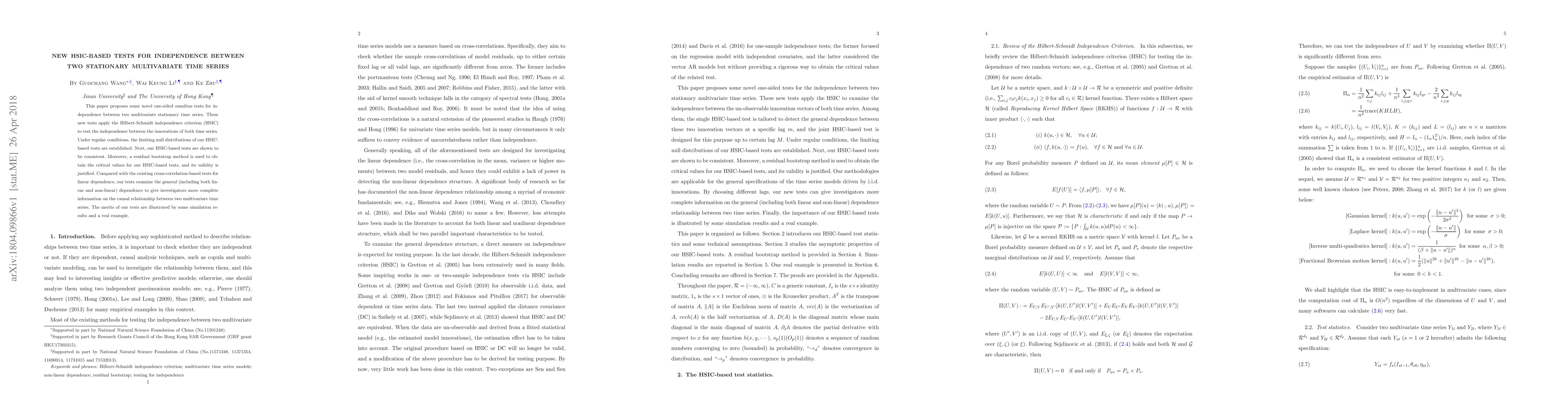 This paper introduces new HSIC-based tests for assessing independence between two multivariate stationary time series, offering a method to detect both linear and non-linear dependencies. The tests' consistency and critical value determination via residual bootstrap are validated, providing a robust alternative to existing cross-correlation-based tests.