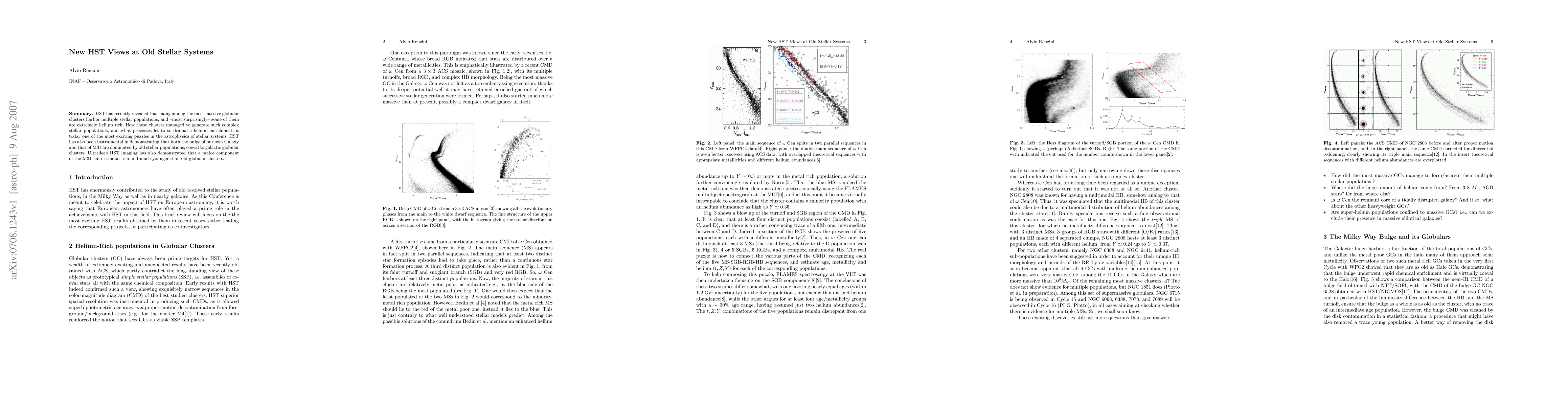 HST has recently revealed that many among the most massive globular clusters harbor multiple stellar populations, and --most surprisingly-- some of them are extremely helium rich. How these clusters managed to generate such complex stellar populations, and what processes let to so dramatic helium enrichment, is today one of the most exciting puzzles in the astrophysics of stellar systems. HST has also been instrumental in demonstrating that both the bulge of our own Galaxy and that of M31 are dominated by old stellar populations, coeval to galactic globular clusters. Ultradeep HST imaging has also demonstrated that a major component of the M31 halo is metal rich and much younger than old globular clusters.