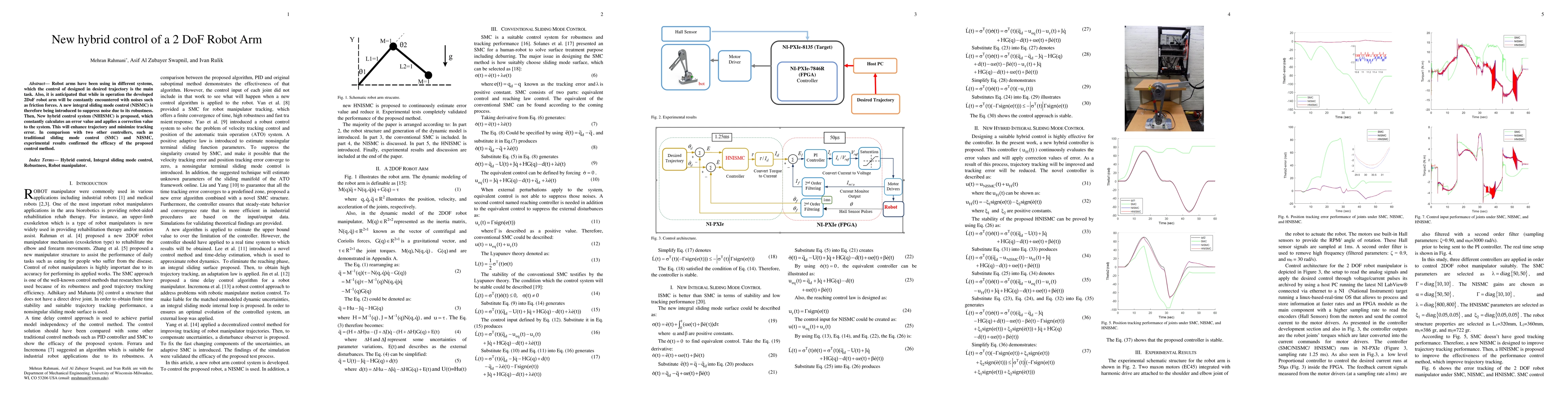 Robot arms have been using in different systems, which the control of designed in desired trajectory is the main task. Also, it is anticipated that while in operation the developed 2DoF robot arm will be constantly encountered with noises such as friction forces. A new integral sliding mode control (NISMC) is therefore being introduced to suppress noise due to its robustness. Then, New hybrid control system (NHISMC) is proposed, which constantly calculates an error value and applies a correction value to the system. This will enhance trajectory and minimize tracking error. In comparison with two other controllers, such as traditional sliding mode control (SMC) and NISMC, experimental results confirmed the efficacy of the proposed control method.