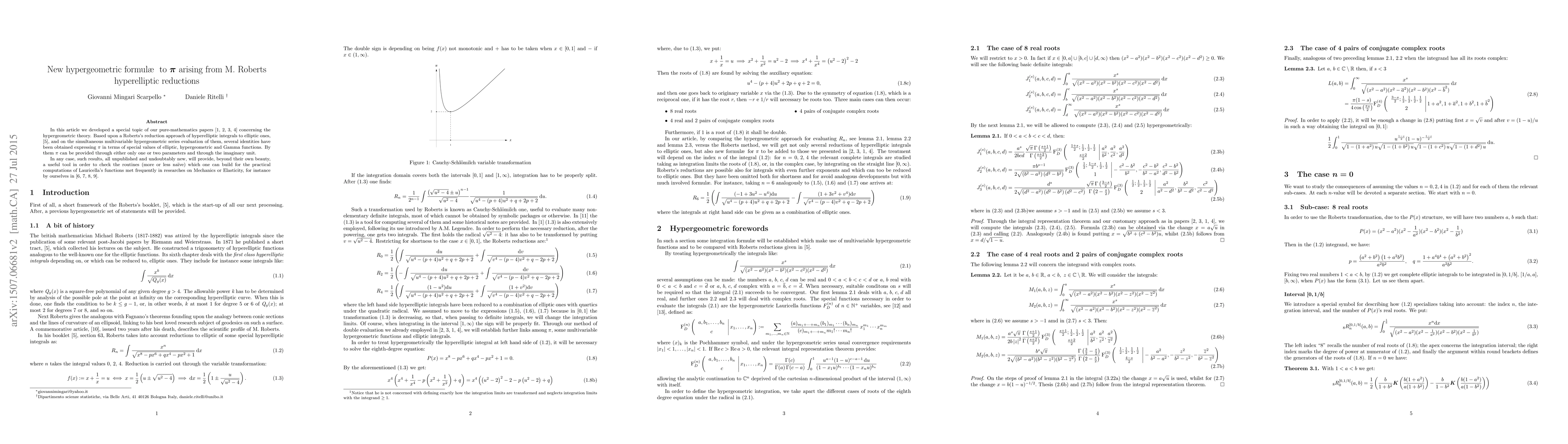 In this article we developed a special topic of our pure-mathematics papers concerning the hypergeometric theory. Based upon a Roberts's reduction approach of hyperelliptic integrals to elliptic ones and on the simultaneous multivariable hypergeometric series evaluation of them, several identities have been obtained expressing $\pi$ in terms of special values of elliptic, hypergeometric and Gamma functions. By them $\pi$ can be provided through either only one or two parameters and through the imaginary unit. In any case, such results, all unpublished and undoubtably new, will provide, beyond their own beauty, a useful tool in order to check the routines (more or less naive) which one can build for the practical computations of Lauricella's functions met frequently in researches on Mechanics or Elasticity.