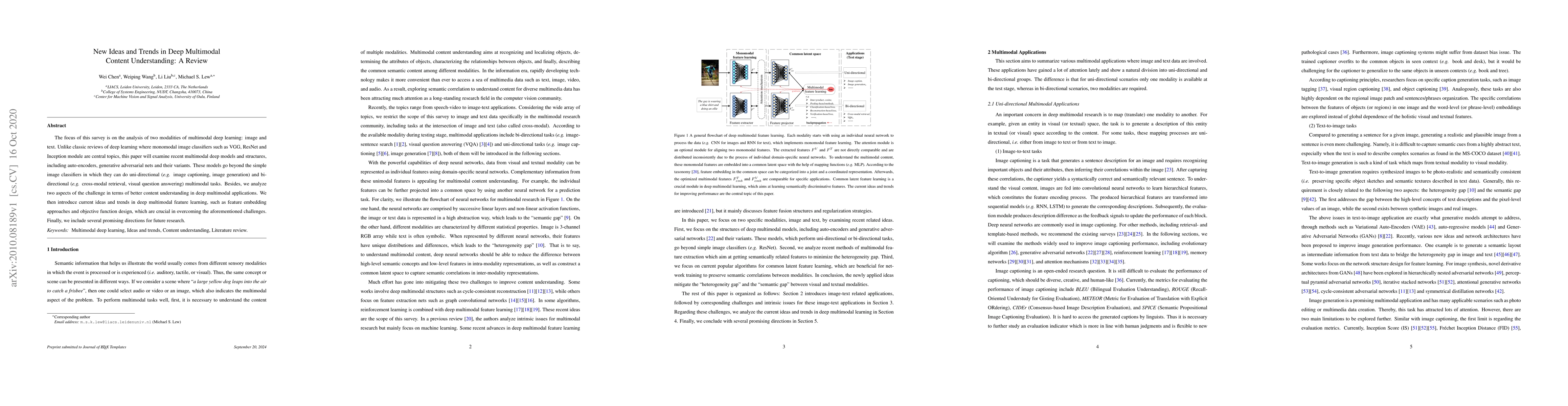 This paper reviews recent advancements in deep multimodal learning focusing on image and text, highlighting models beyond traditional monomodal classifiers, and discusses challenges in deep multimodal content understanding, current trends in feature learning, and future research directions.