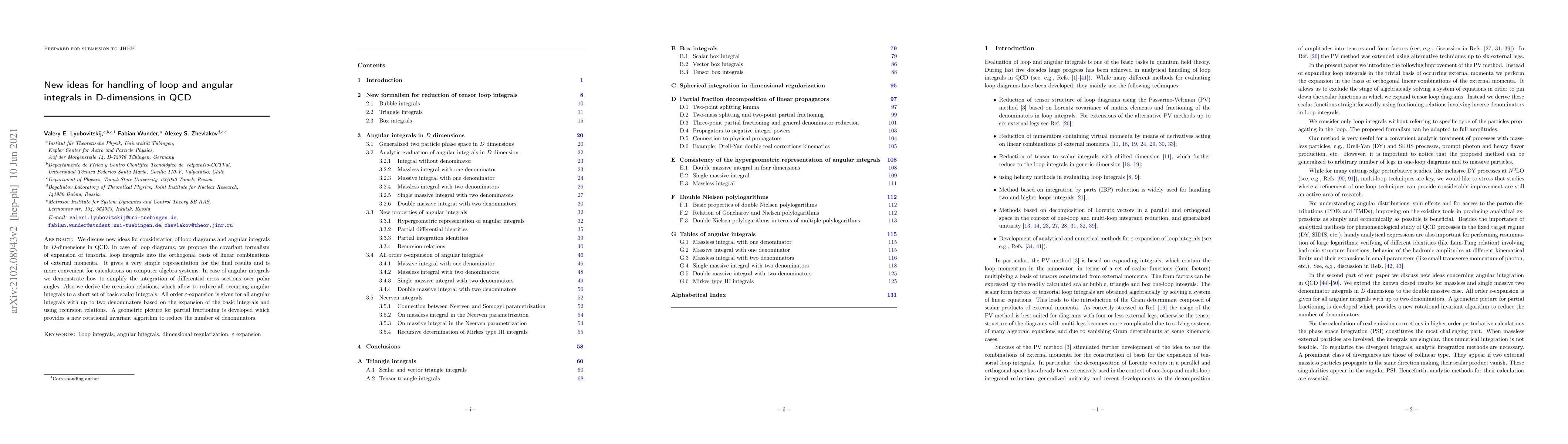 We discuss new ideas for consideration of loop diagrams and angular integrals in $D$-dimensions in QCD. In case of loop diagrams, we propose the covariant formalism of expansion of tensorial loop integrals into the orthogonal basis of linear combinations of external momenta. It gives a very simple presentation for the final results and is more convenient for calculations on computer algebra systems. In case of angular integrals we demonstrate how to simplify the integration of differential cross sections over polar angles. Also we derive the recursion relations, which allow to reduce all occurring angular integrals to a short set of basic scalar integrals. All order $\epsilon$-expansion is given for all angular integrals with up to two denominators based on the expansion of the basic integrals and using recursion relations. A geometric picture for partial fractioning is developed which provides a new rotational invariant algorithm to reduce the number of denominators.
