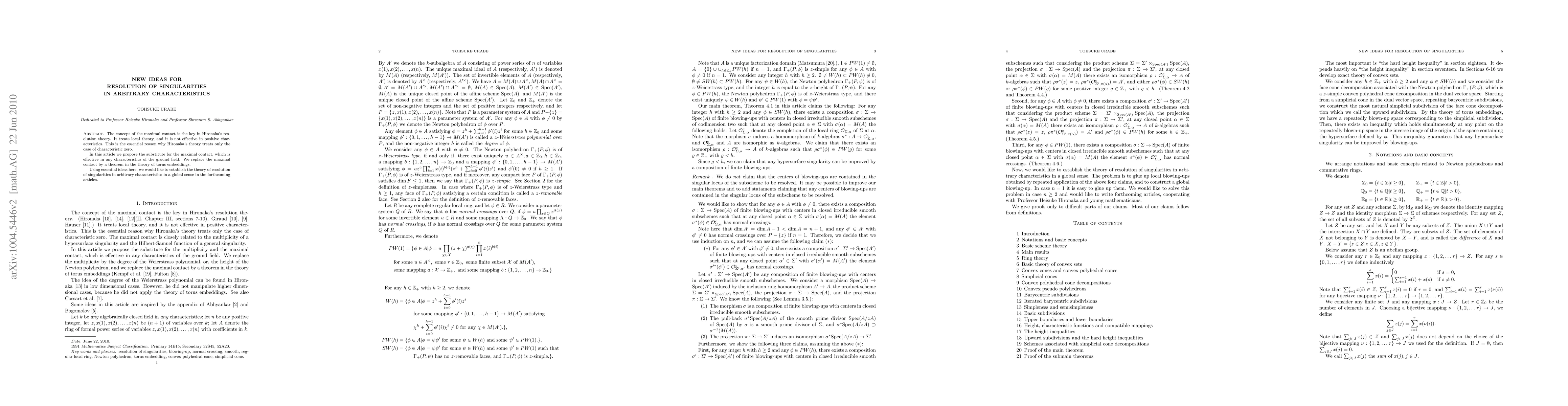 The concept of the maximal contact is the key in Hironaka's resolution theory. It treats local theory, and it is not effective in positive characteristics. This is the essential reason why Hironaka's theory treats only the case of characteristic zero. In this article we propose the substitute for the maximal contact, which is effective in any characteristics of the ground field. We replace the maximal contact by a theorem in the theory of torus embeddings. Using essential ideas here, we would like to establish the theory of resolution of singularities in arbitrary characteristics in a global sense in the forthcoming articles.