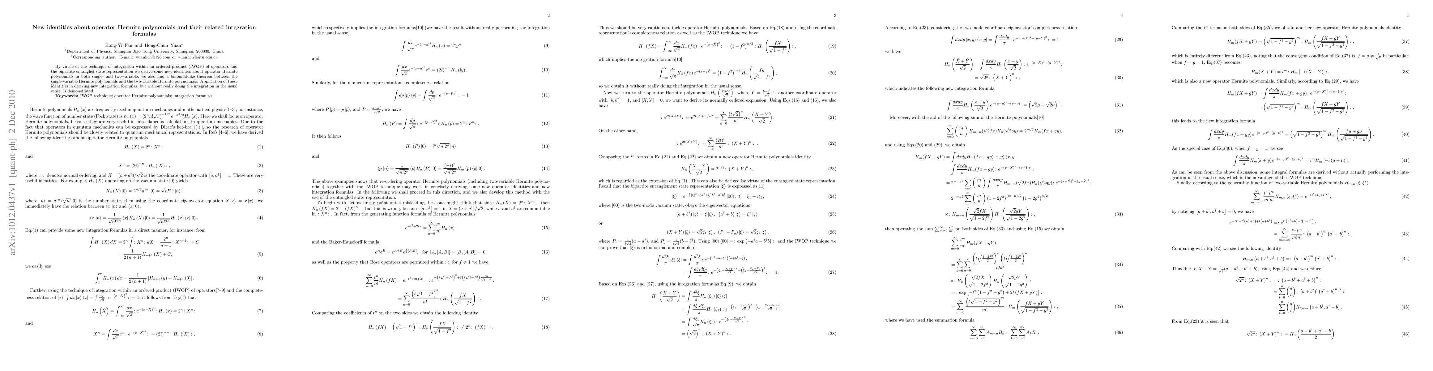 By virtue of the technique of integration within an ordered product (IWOP) of operators and the bipartite entangled state representation we derive some new identities about operator Hermite polynomials in both single- and two-variable, we also find a binomial-like theorem between the single-variable Hermite polynomials and the two-variable Hermite polynomials. Application of these identities in deriving new integration formulas, but without really doing the integration in the usual sense, is demonstrated.