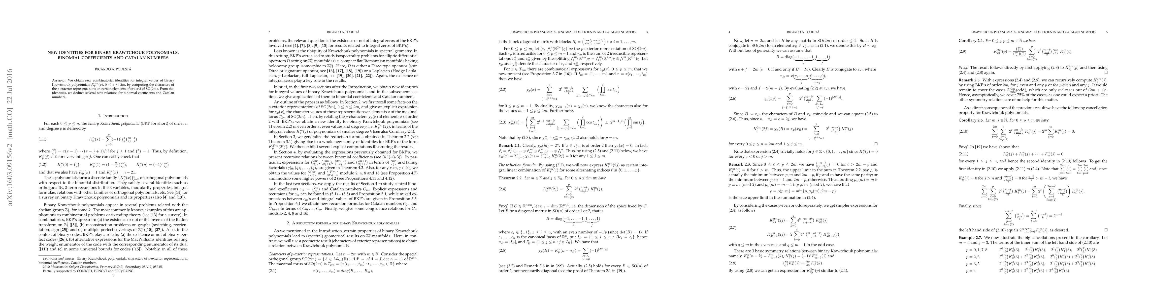 Summary: The paper establishes new combinatorial identities for binary Krawtchouk polynomials using $p$-exterior representations, and derives novel relations for binomial coefficients and Catalan numbers from these identities.