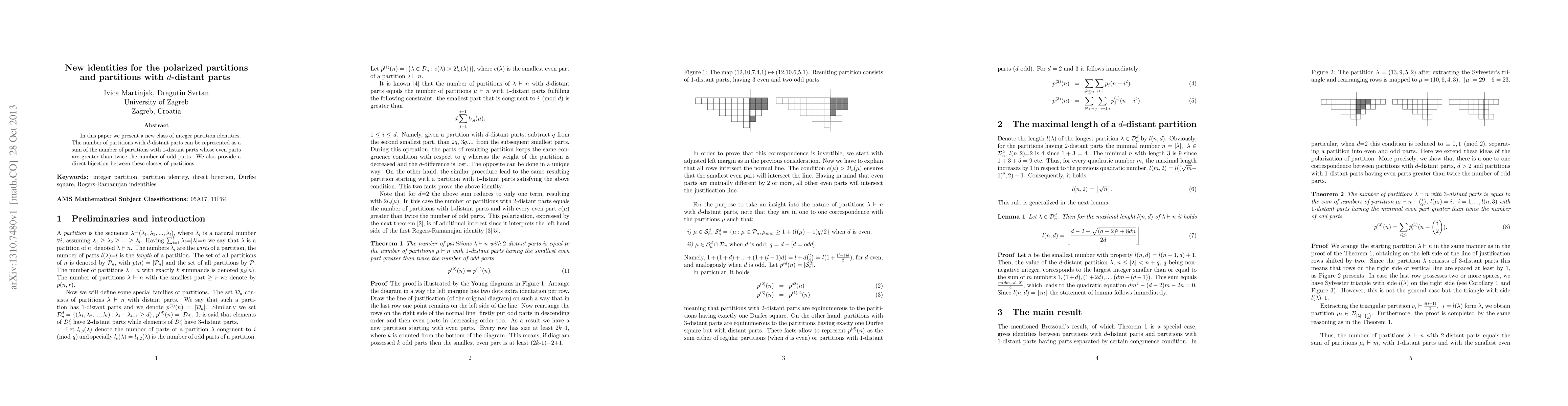Summary: This paper introduces new identities for polarized partitions and partitions with $d$-distant parts, showing that the former can be represented as a sum involving the latter, with a direct bijection established between the two classes.