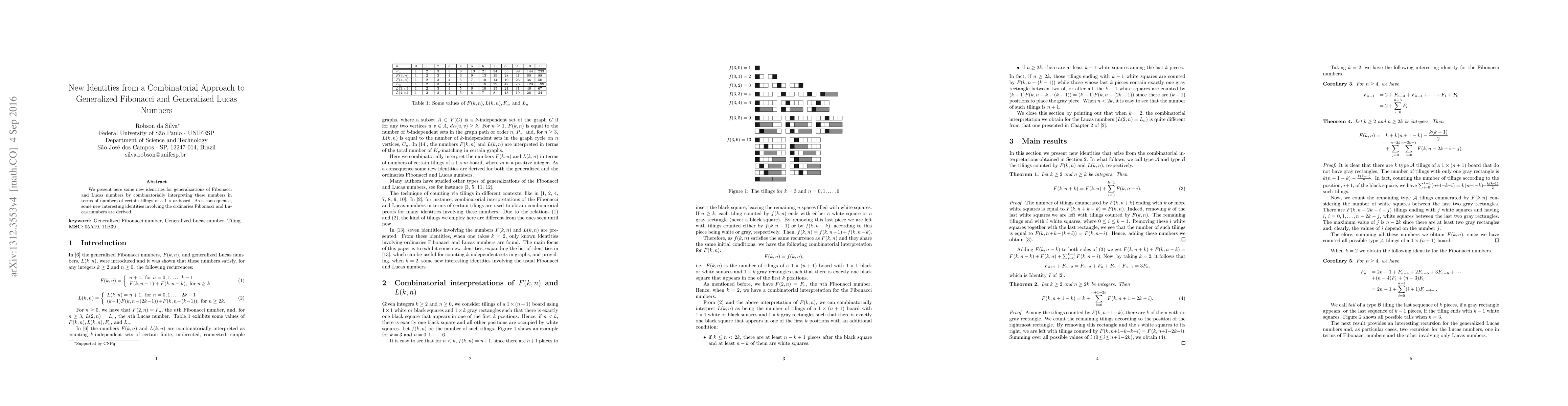 This paper introduces new identities for generalized Fibonacci and Lucas numbers through combinatorial interpretations based on tilings of a $1 \times m$ board, leading to novel insights into the ordinary Fibonacci and Lucas sequences.