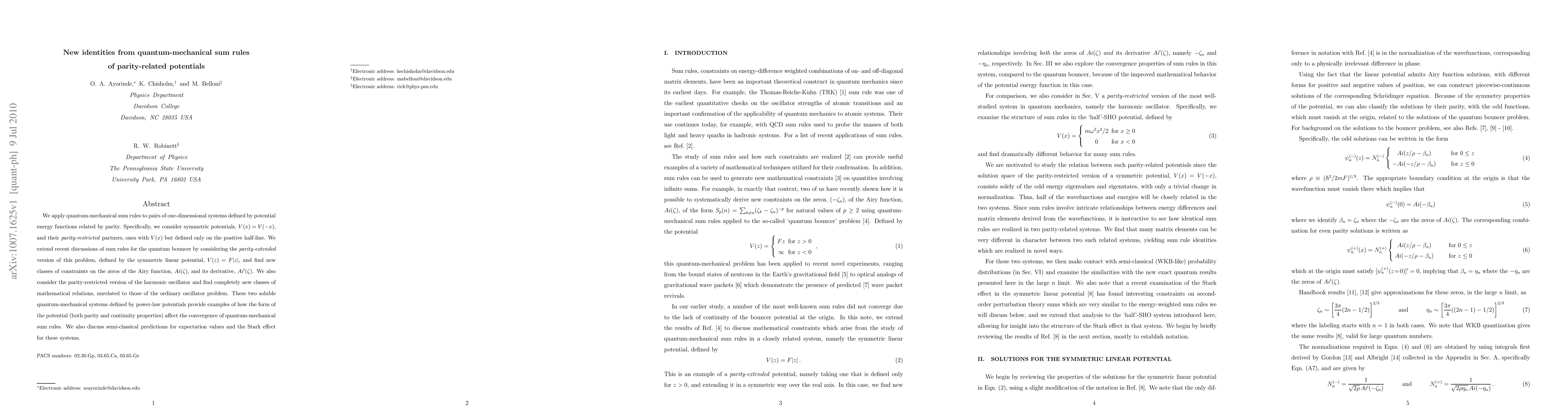 We apply quantum mechanical sum rules to pairs of one-dimensional systems defined by potential energy functions related by parity. Specifically, we consider symmetric potentials, $V(x) = V(-x)$, and their parity-restricted partners, ones with $V(x)$, but defined only on the positive half-line. We extend recent discussions of sum rules for the quantum bouncer by considering the parity-extended version of this problem, defined by the symmetric linear potential, $V(z) = F|z|$ and find new classes of constraints on the zeros of the Airy function, $Ai(z)$, and its derivative $Ai'(z)$. We also consider the parity-restricted version of the harmonic oscillator and find completely new classes of mathematical relations, unrleated to those of the ordinary oscillator problem. These two soluble quantum-mechanical systems defined by power-law potentials provide examples of how the form of the potential (both parity and continuity properties) affects the convergence of quantum-mechanical sum rules. We also discuss semi-classical predictions for expectation values and the Stark effect for these systems.