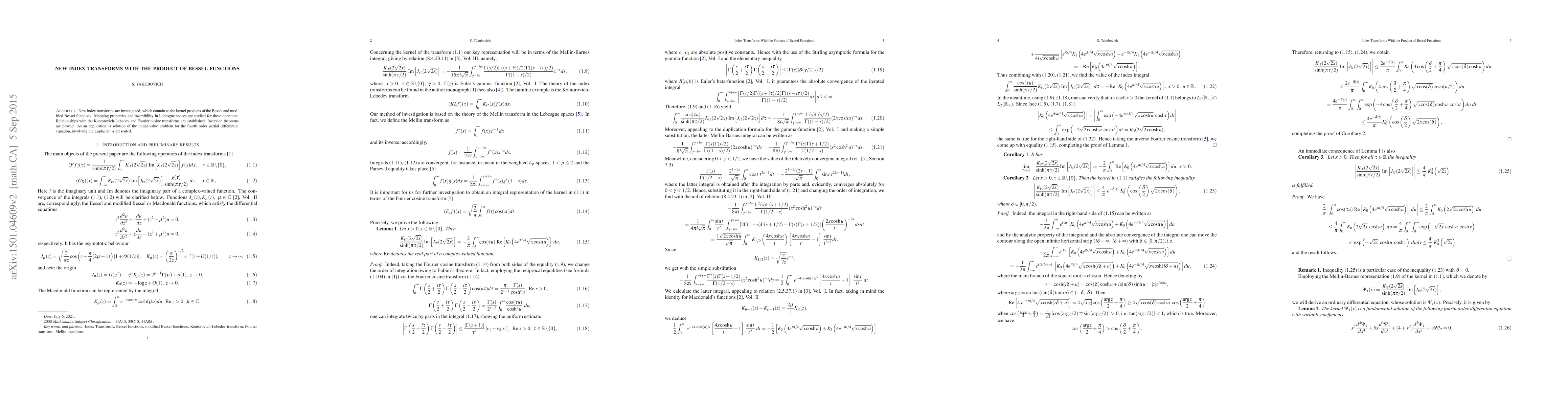 New index transforms are investigated, which contain as the kernel products of the Bessel and modified Bessel functions. Mapping properties and invertibility in Lebesgue spaces are studied for these operators. Relationships with the Kontorovich-Lebedev and Fourier cosine transforms are established. Inversion theorems are proved. As an application, a solution of the initial value problem for the fourth order partial differential equation, involving the Laplacian is presented.