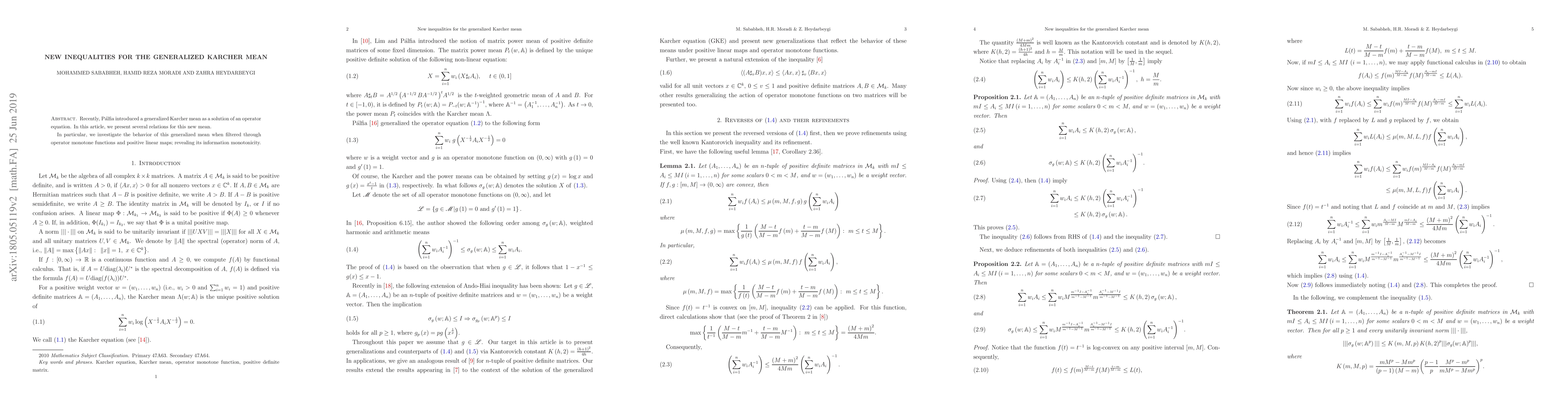 This paper introduces a generalized Karcher mean defined via an operator equation and explores its properties, including information monotonicity and behavior under positive linear maps. It reveals new inequalities and relations for this mean.