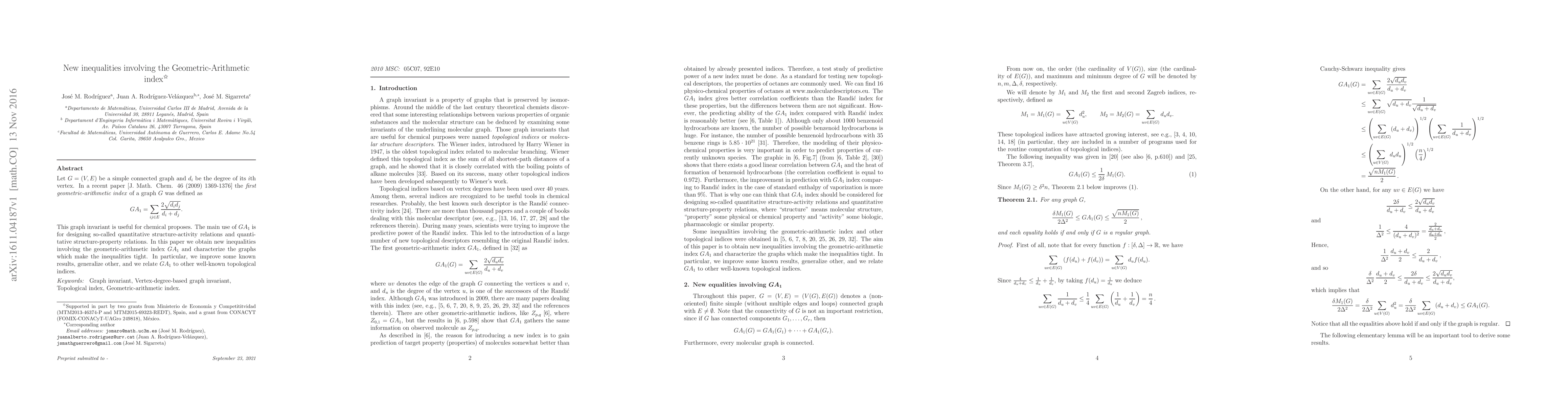 Let $G=(V,E)$ be a simple connected graph and $d_i$ be the degree of its $i$th vertex. In a recent paper [J. Math. Chem. 46 (2009) 1369-1376] the first geometric-arithmetic index of a graph $G$ was defined as $$GA_1=\sum_{ij\in E}\frac{2 \sqrt{d_i d_j}}{d_i + d_j}.$$ This graph invariant is useful for chemical proposes. The main use of $GA_1$ is for designing so-called quantitative structure-activity relations and quantitative structure-property relations. In this paper we obtain new inequalities involving the geometric-arithmetic index $GA_1$ and characterize the graphs which make the inequalities tight. In particular, we improve some known results, generalize other, and we relate $GA_1$ to other well-known topological indices.