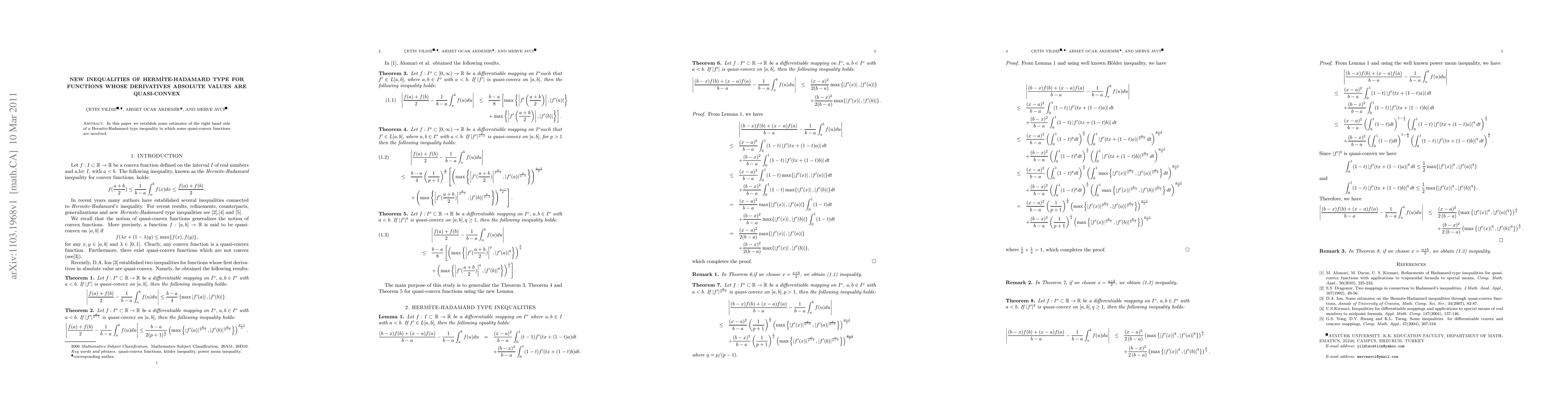 Summary: This paper presents new inequalities of Hermite-Hadamard type for functions where the absolute values of their derivatives are quasi-convex, providing estimates for the right-hand side of these inequalities.