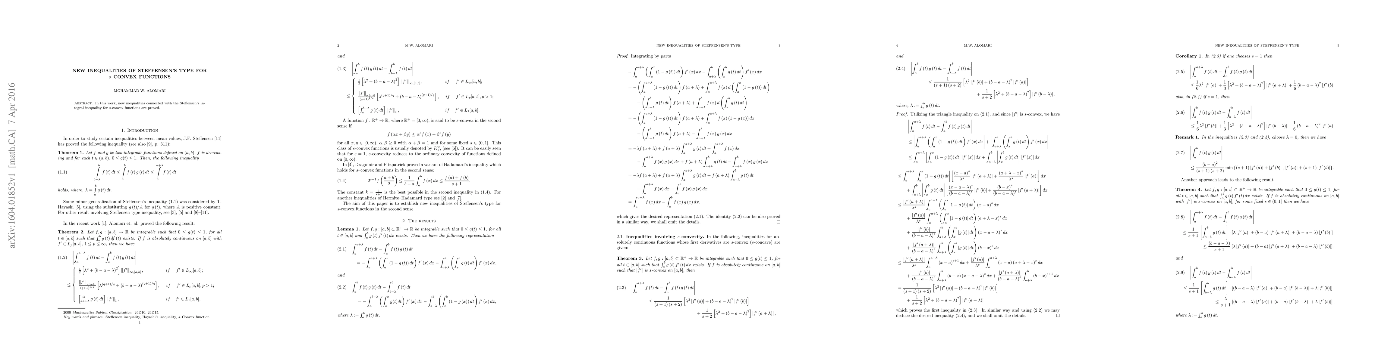 Summary: This paper introduces novel inequalities related to Steffensen's integral inequality, specifically for s-convex functions, providing new mathematical results in the field of convex analysis. The findings extend the understanding of Steffensen-type inequalities in the context of s-convexity.