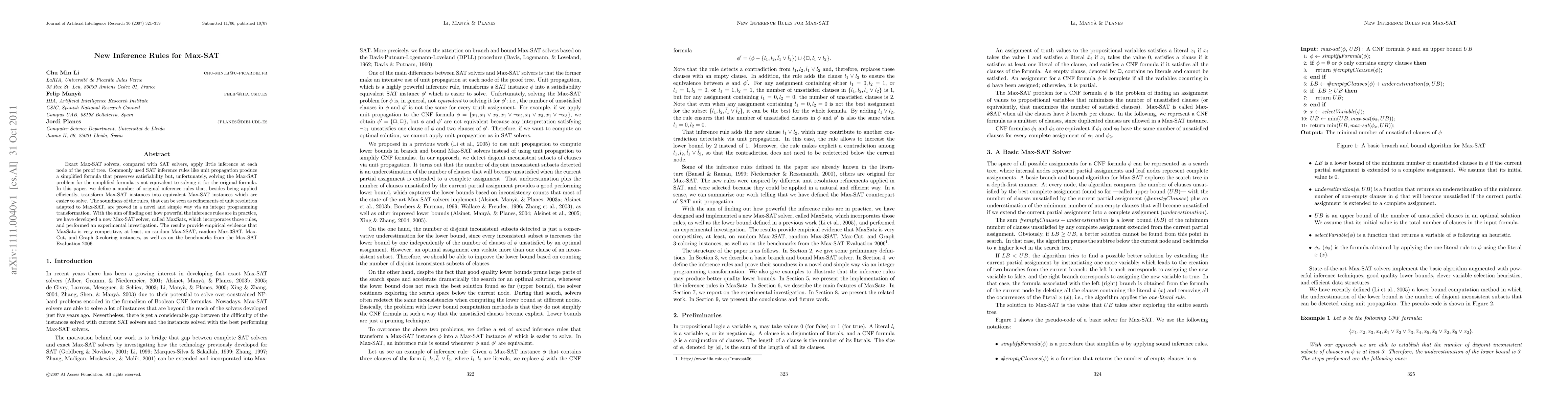 This paper introduces new inference rules for Max-SAT that transform instances into equivalent, easier-to-solve forms, and proves their soundness via integer programming. A new solver, MaxSatz, incorporating these rules, shows competitive performance on various benchmarks.