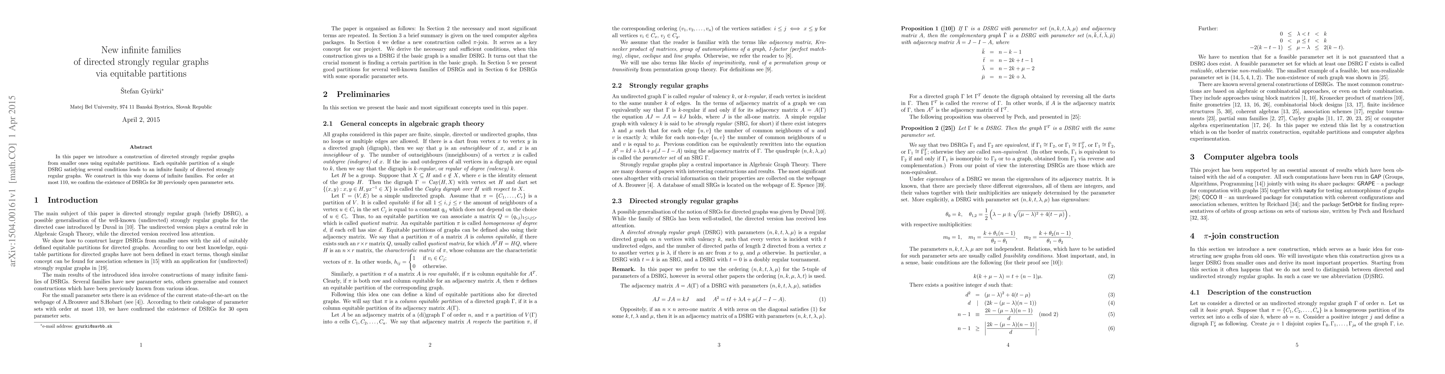 This paper presents a method to construct new infinite families of directed strongly regular graphs (DSRGs) using equitable partitions of existing DSRGs. The authors confirm the existence of DSRGs for 30 previously unresolved parameter sets for orders up to 110.