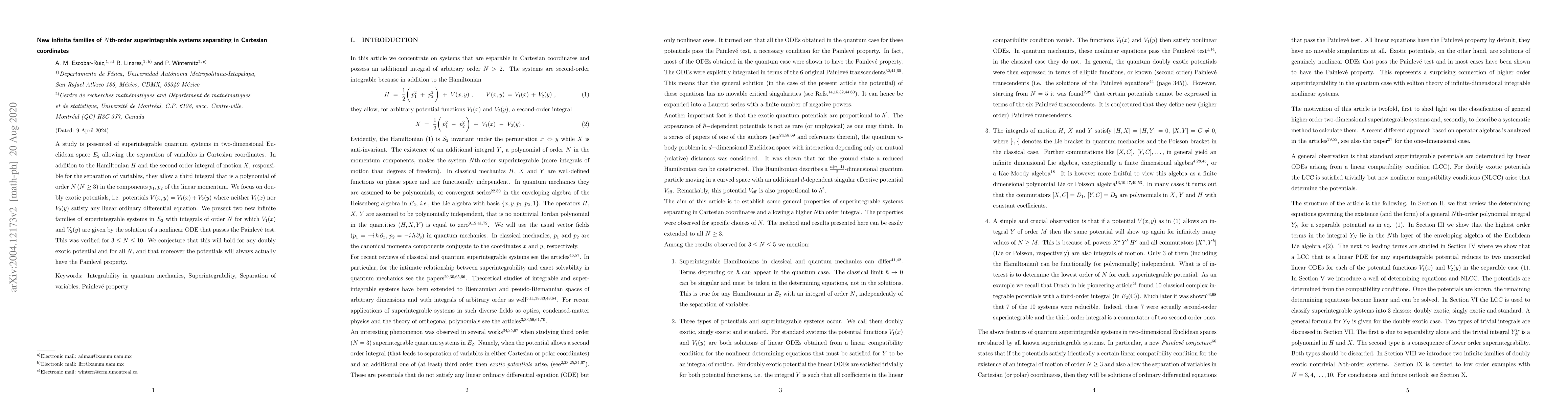 This paper explores new infinite families of $N$th-order superintegrable quantum systems in $E_2$ that allow variable separation in Cartesian coordinates. It introduces doubly exotic potentials that satisfy nonlinear ODEs passing the Painlevé test, and conjectures that these potentials will always exhibit the Painlevé property for any $N$.
