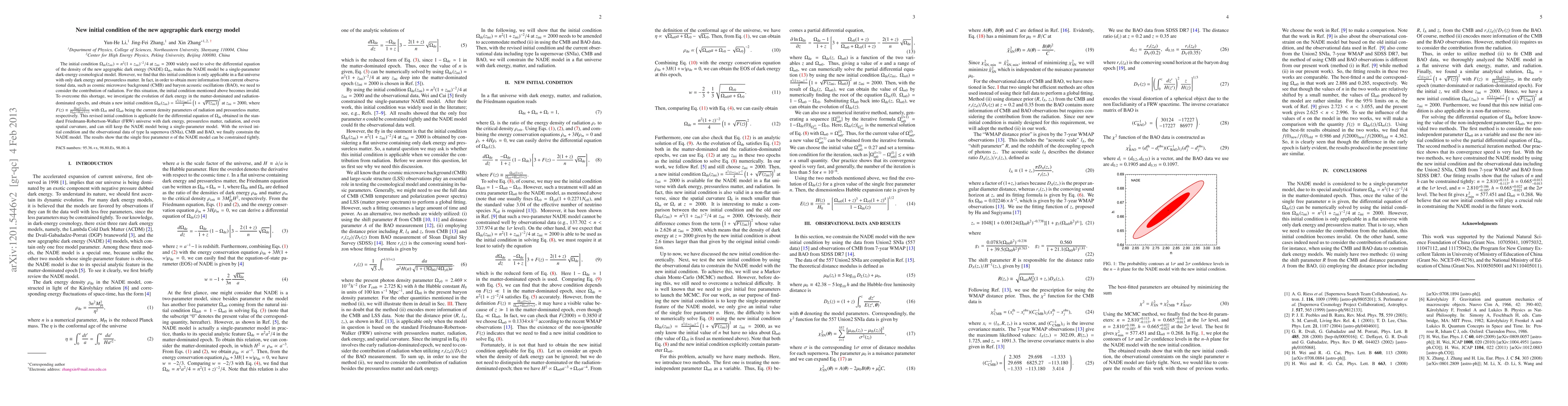 The initial condition $\Omega_{\rm de}(z_{\rm ini})=n^2(1+z_{\rm ini})^{-2}/4$ at $z_{\rm ini}=2000$ widely used to solve the differential equation of the density of the new agegraphic dark energy (NADE) $\Omega_{\rm de}$, makes the NADE model be a single-parameter dark-energy cosmological model. However, we find that this initial condition is only applicable in a flat universe with only dark energy and pressureless matter. In fact, in order to obtain more information from current observational data, such as cosmic microwave background (CMB) and baryon acoustic oscillations (BAO), we need to consider the contribution of radiation. For this situation, the initial condition mentioned above becomes invalid. To overcome this shortage, we investigate the evolution of dark energy in the matter-dominated and radiation-dominated epochs, and obtain a new initial condition $\Omega_{\rm de}(z_{\rm ini})=\frac{n^2(1+z_{\rm ini})^{-2}}{4}(1+\sqrt{F(z_{\rm ini})})^2$ at $z_{\rm ini}=2000$, where $F(z)\equiv\frac{\Omega_{r0}(1+z)}{\Omega_{m0}+\Omega_{r0}(1+z)}$ with $\Omega_{r0}$ and $\Omega_{m0}$ being the current density parameters of radiation and pressureless matter, respectively. This revised initial condition is applicable for the differential equation of $\Omega_{\rm de}$ obtained in the standard Friedmann-Robertson-Walker (FRW) universe with dark energy, pressureless matter, radiation, and even spatial curvature, and can still keep the NADE model being a single-parameter model. With the revised initial condition and the observational data of type Ia supernova (SNIa), CMB and BAO, we finally constrain the NADE model. The results show that the single free parameter $n$ of the NADE model can be constrained tightly.