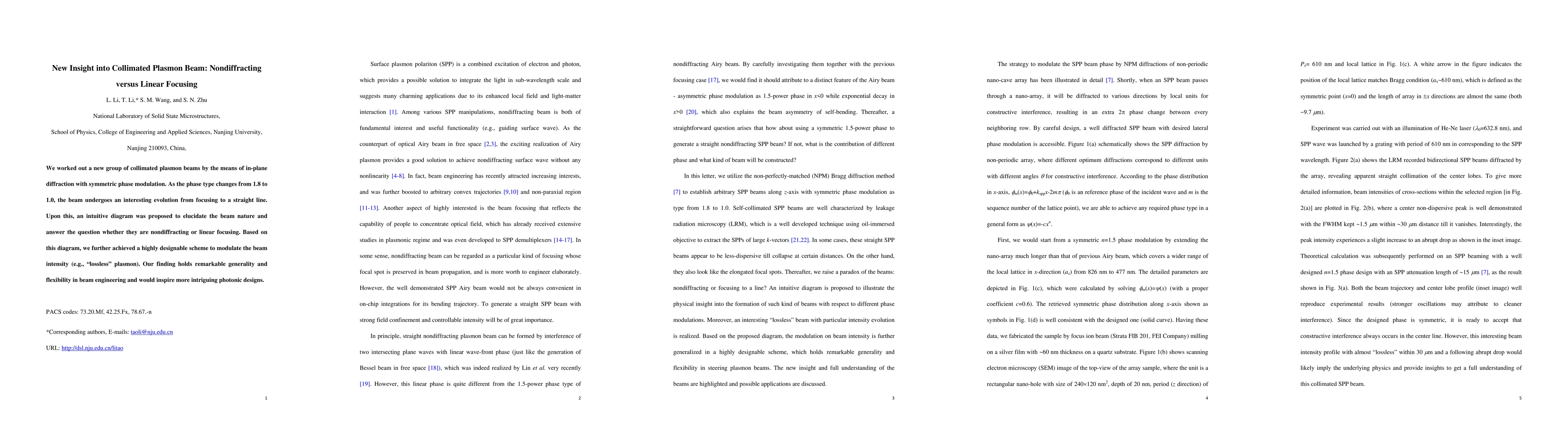 We worked out a new group of collimated plasmon beams by the means of in-plane diffraction with symmetric phase modulation. As the phase type changes from 1.8 to 1.0, the beam undergoes an interesting evolution from focusing to a straight line. Upon this, an intuitive diagram was proposed to elucidate the beam nature and answer the question whether they are nondiffracting or linear focusing. Based on this diagram, we further achieved a highly designable scheme to modulate the beam intensity (e.g., 'lossless' plasmon). Our finding holds remarkable generality and flexibility in beam engineering and would inspire more intriguing photonic designs.