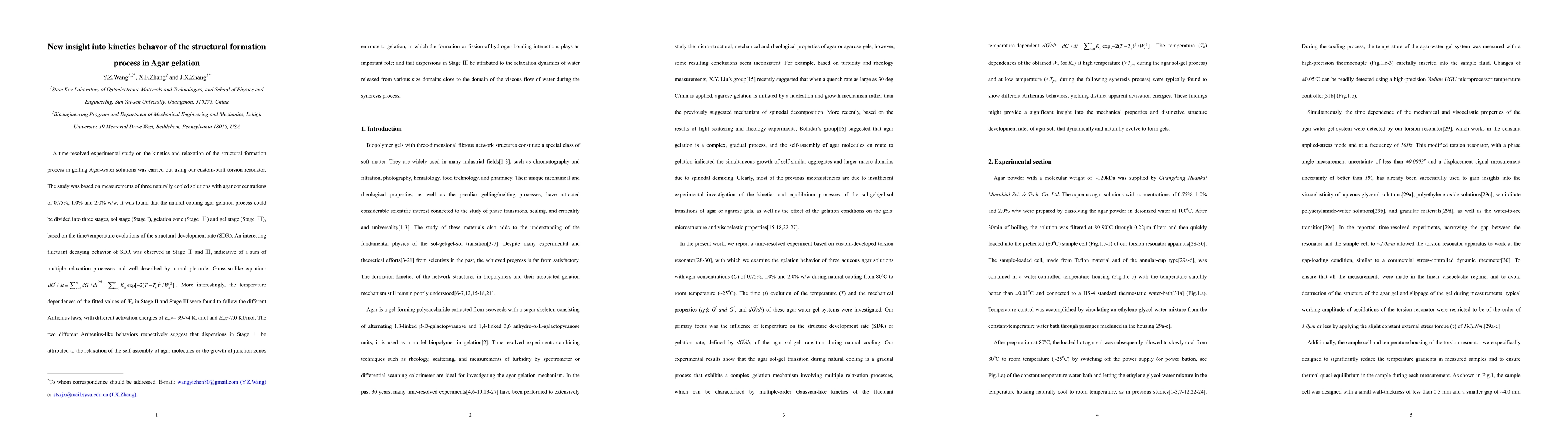 Researchers used a custom-built torsion resonator to study the kinetics of Agar gelation, finding three stages: sol, gelation zone, and gel stage with distinct relaxation processes; temperature-dependent behaviors indicating different activation energies for each stage.