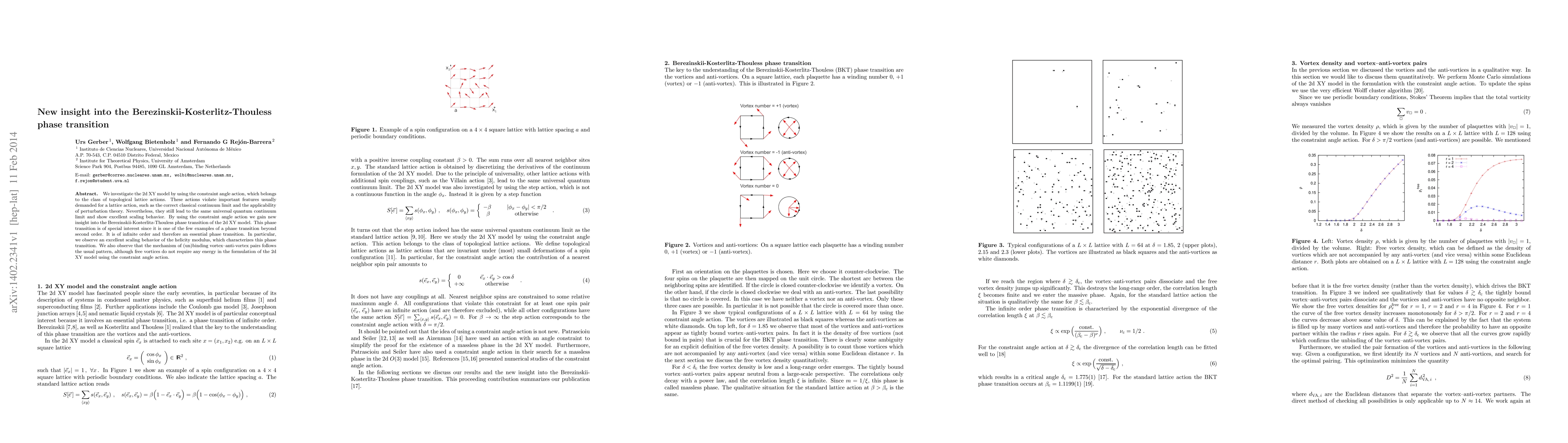 We investigate the 2d XY model by using the constraint angle action, which belongs to the class of topological lattice actions. These actions violate important features usually demanded for a lattice action, such as the correct classical continuum limit and the applicability of perturbation theory. Nevertheless, they still lead to the same universal quantum continuum limit and show excellent scaling behavior. By using the constraint angle action we gain new insight into the Berezinskii-Kosterlitz-Thouless phase transition of the 2d XY model. This phase transition is of special interest since it is one of the few examples of a phase transition beyond second order. It is of infinite order and therefore an essential phase transition. In particular, we observe an excellent scaling behavior of the helicity modulus, which characterizes this phase transition. We also observe that the mechanism of (un)binding vortex--anti-vortex pairs follows the usual pattern, although free vortices do not require any energy in the formulation of the 2d XY model using the constraint angle action.