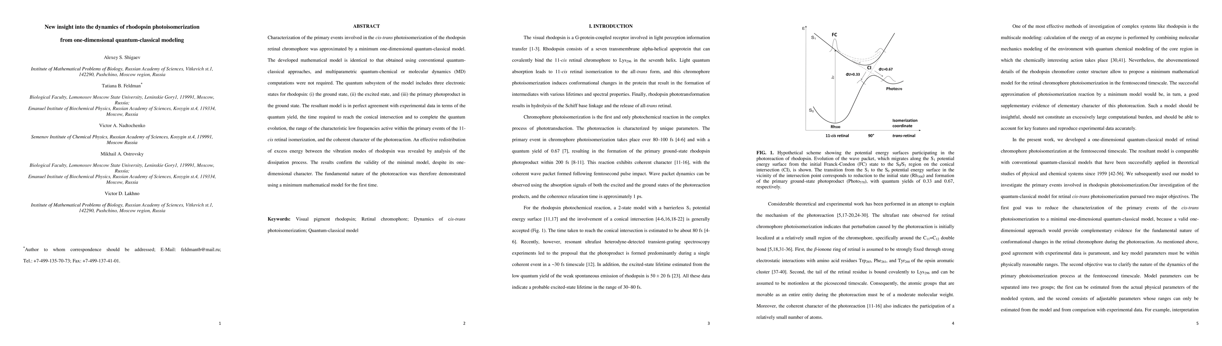 This paper presents a one-dimensional quantum-classical model that accurately describes the primary photoisomerization events of rhodopsin's retinal chromophore, confirming the model's validity through agreement with experimental data and revealing effective energy redistribution in the dissipation process. The minimal model demonstrates the fundamental nature of the photoreaction without requiring complex quantum-chemical or molecular dynamics computations.