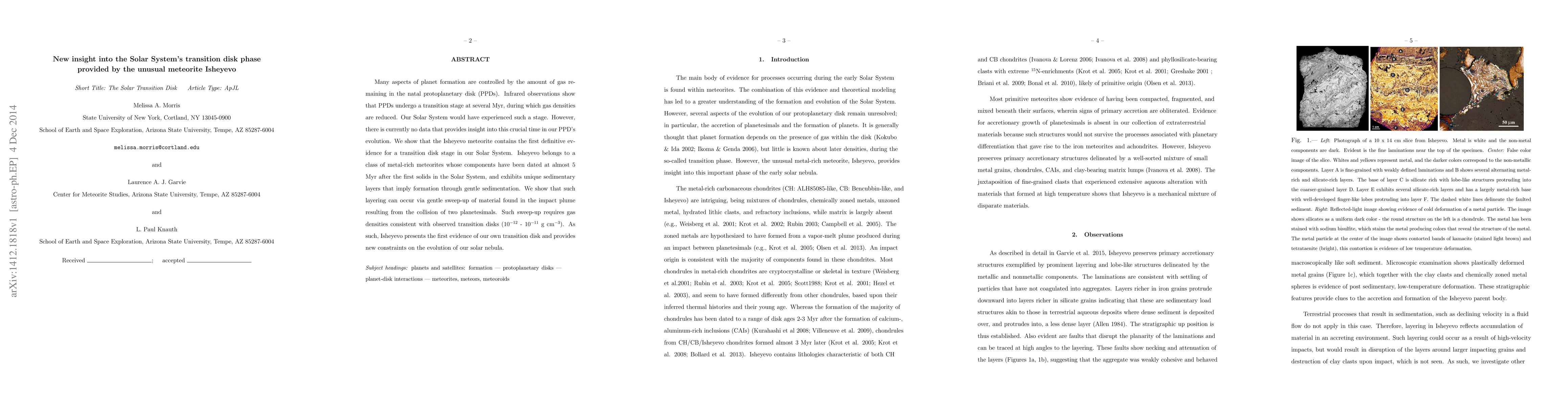 The meteorite Isheyevo, dated at 5 Myr, reveals the first evidence of a transition disk phase in our Solar System's evolution. Its unique sedimentary layers, formed by gentle sedimentation from planetesimal collisions, indicate gas densities consistent with transition disks observed in other systems.