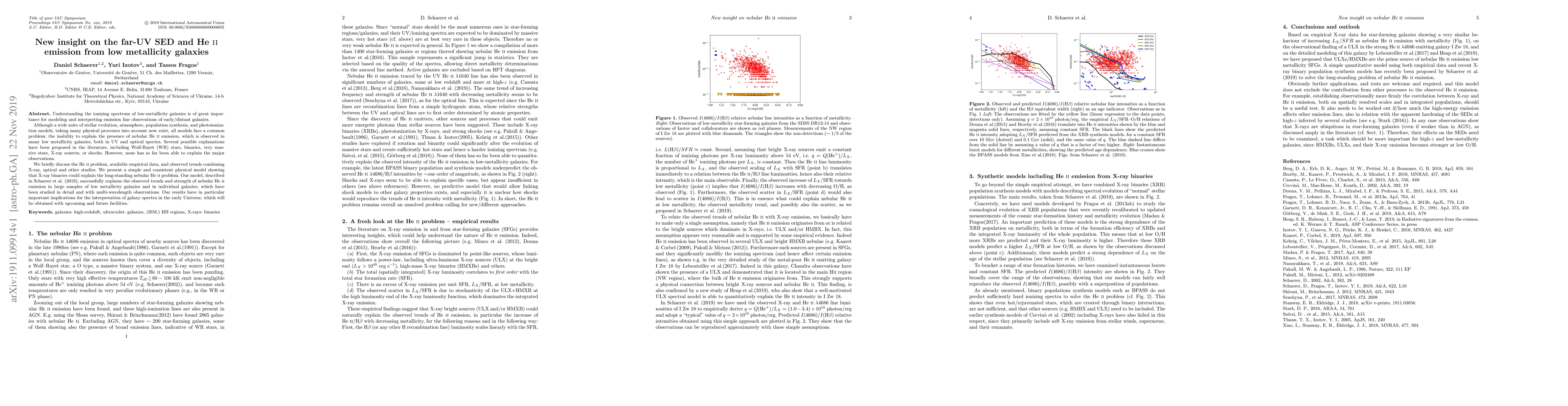 Understanding the ionizing spectrum of low-metallicity galaxies is of great importance for modeling and interpreting emission line observations of early/distant galaxies. Although a wide suite of stellar evolution, atmosphere, population synthesis, and photoionization models, taking many physical processes into account now exist, all models face a common problem: the inability to explain the presence of nebular HeII emission, which is observed in many low metallicity galaxies, both in UV and optical spectra. Several possible explanations have been proposed in the literature, including Wolf-Rayet (WR) stars, binaries, very massive stars, X-ray sources, or shocks. However, none has so far been able to explain the major observations. We briefly discuss the HeII problem, available empirical data, and observed trends combining X-ray, optical and other studies. We present a simple and consistent physical model showing that X-ray binaries could explain the long-standing nebular HeII problem. Our model, described in Schaerer et al. (2019), successfully explains the observed trends and strength of nebular HeII emission in large samples of low metallicity galaxies and in individual galaxies, which have been studied in detail and with multi-wavelength observations. Our results have in particular important implications for the interpretation of galaxy spectra in the early Universe, which will be obtained with upcoming and future facilities.