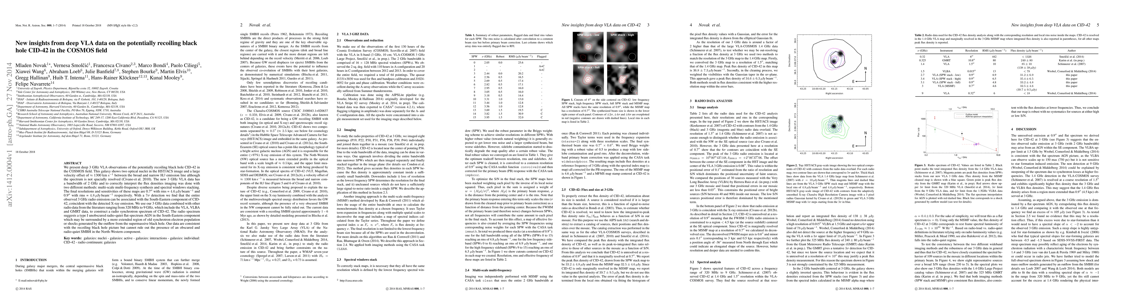 We present deep 3 GHz VLA observations of the potentially recoiling black hole CID-42 in the COSMOS field. This galaxy shows two optical nuclei in the HST/ACS image and a large velocity offset of ~ 1300 km/s between the broad and narrow H beta emission line although the spectrum is not spacially resolved (Civano et al. 2010). The new 3 GHz VLA data has a bandwidth of 2 GHz and to correctly interpret the flux densities imaging was done with two different methods: multi-scale multi-frequency synthesis and spectral windows stacking. The final resolutions and sensitivities of these maps are 0.7" with rms = 4.6 muJy/beam and 0.9" with rms = 4.8 muJy/beam respectively. With a 7 sigma detection we find that the entire observed 3 GHz radio emission can be associated with the South-Eastern component of CID-42, coincident with the detected X-ray emission. We use our 3 GHz data combined with other radio data from the literature ranging from 320 MHz to 9 GHz, which include the VLA, VLBA and GMRT data, to construct a radio synchrotron spectrum of CID-42. The radio spectrum suggests a type I unobscured radio-quiet flat-spectrum AGN in the South-Eastern component which may be surrounded by a more extended region of old synchrotron electron population or shocks generated by the outflow from the supermassive black hole. Our data are consistent with the recoiling black hole picture but cannot rule out the presence of an obscured and radio-quiet SMBH in the North-Western component.