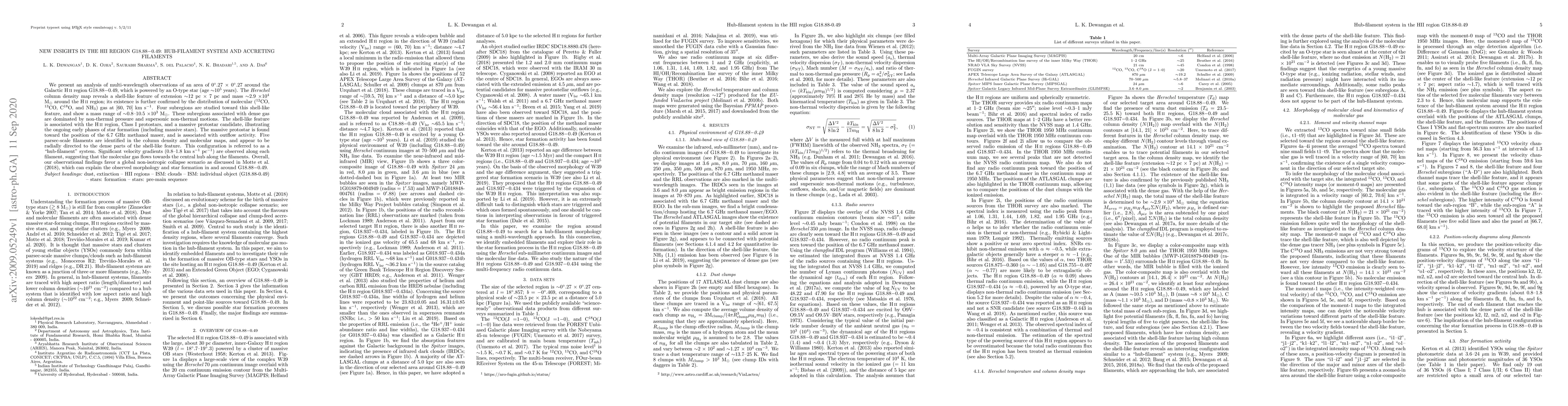 We present an analysis of multi-wavelength observations of an area of 0.27 deg x 0.27 deg around the Galactic HII region G18.88-0.49, which is powered by an O-type star (age ~10^5 years). The Herschel column density map reveals a shell-like feature of extension ~12 pc x 7 pc and mass ~2.9 x 10^4 Msun around the HII region; its existence is further confirmed by the distribution of molecular (12CO, 13CO, C18O, and NH3) gas at [60, 70] km/s. Four subregions are studied toward this shell-like feature, and show a mass range of ~0.8-10.5 x 10^3 Msun. These subregions associated with dense gas are dominated by non-thermal pressure and supersonic non-thermal motions. The shell-like feature is associated with the HII region, Class I protostars, and a massive protostar candidate, illustrating the ongoing early phases of star formation (including massive stars). The massive protostar is found toward the position of the 6.7 GHz methanol maser, and is associated with outflow activity. Five parsec-scale filaments are identified in the column density and molecular maps, and appear to be radially directed to the dense parts of the shell-like feature. This configuration is referred to as a "hub-filament" system. Significant velocity gradients (0.8-1.8 km/s/pc) are observed along each filament, suggesting that the molecular gas flows towards the central hub along the filaments. Overall, our observational findings favor a global non-isotropic collapse scenario as discussed in Motte et al. (2018), which can explain the observed morphology and star formation in and around G18.88-0.49.