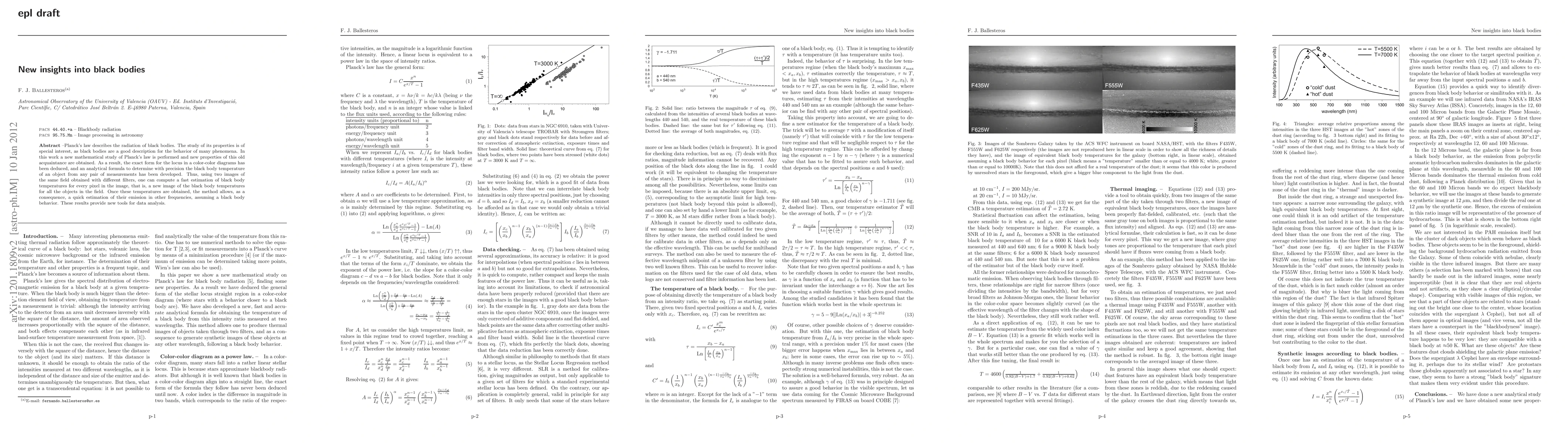 Planck's law describes the radiation of black bodies. The study of its properties is of special interest, as black bodies are a good description for the behavior of many phenomena. In this work a new mathematical study of Planck's law is performed and new properties of this old acquaintance are obtained. As a result, the exact form for the locus in a color-color diagrams has been deduced, and an analytical formula to determine with precision the black body temperature of an object from any pair of measurements has been developed. Thus, using two images of the same field obtained with different filters, one can compute a fast estimation of black body temperatures for every pixel in the image, that is, a new image of the black body temperatures for all the objects in the field. Once these temperatures are obtained, the method allows, as a consequence, a quick estimation of their emission in other frequencies, assuming a black body behavior. These results provide new tools for data analysis.