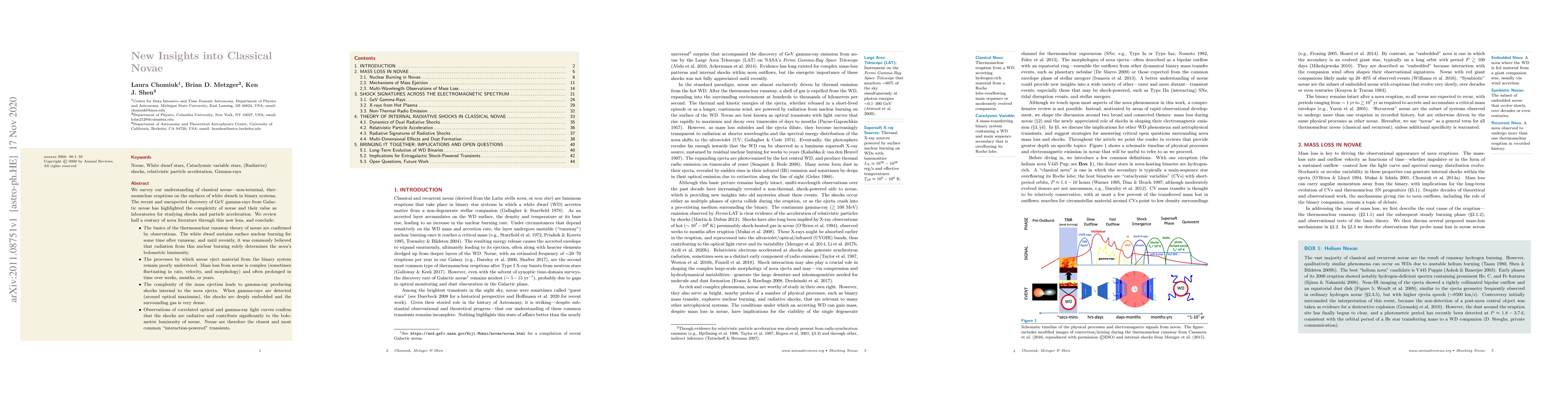 This paper reviews classical novae, confirming the thermonuclear runaway theory and highlighting the recent discovery of GeV gamma-rays, which reveals complex mass ejection processes and internal shocks contributing significantly to nova luminosity.