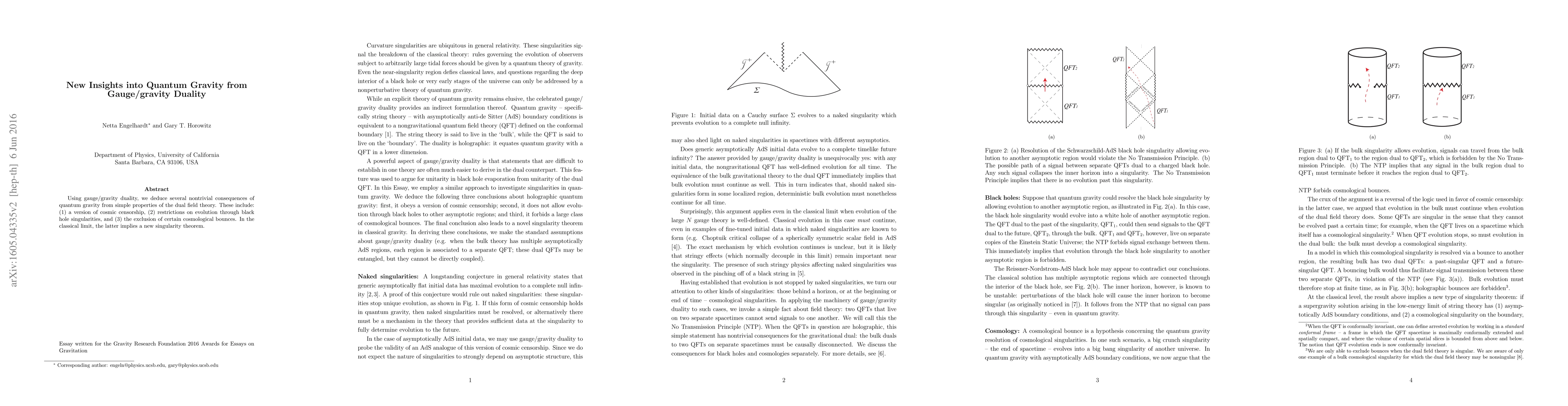 Using gauge/gravity duality, we deduce several nontrivial consequences of quantum gravity from simple properties of the dual field theory. These include: (1) a version of cosmic censorship, (2) restrictions on evolution through black hole singularities, and (3) the exclusion of certain cosmological bounces. In the classical limit, the latter implies a new singularity theorem.