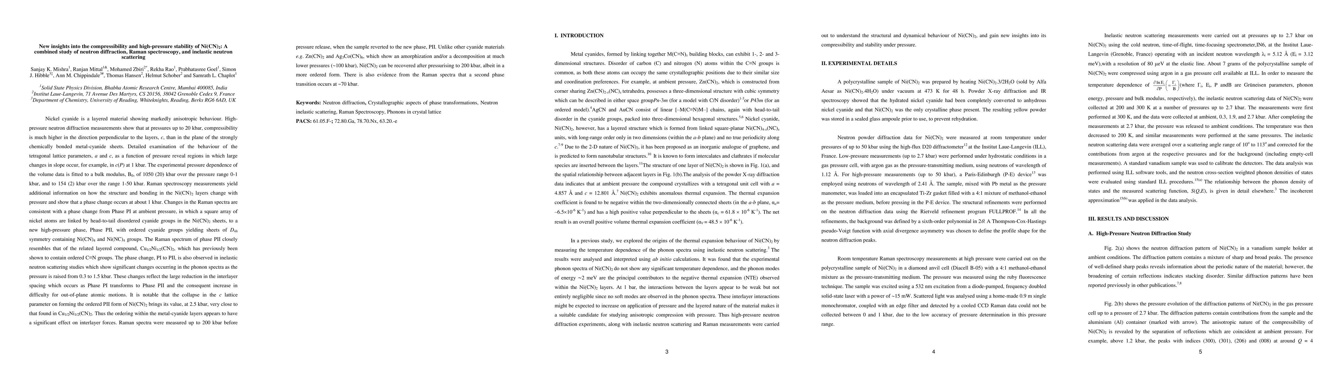 This study investigates the compressibility and high-pressure stability of Ni(CN)2 using neutron diffraction, Raman spectroscopy, and inelastic neutron scattering. The results show anisotropic compression, with significant changes in the c-axis lattice parameter and a phase transition at 1 kbar, supported by Raman measurements. The bulk modulus varies significantly with pressure, indicating a second phase transition around 70 kbar.