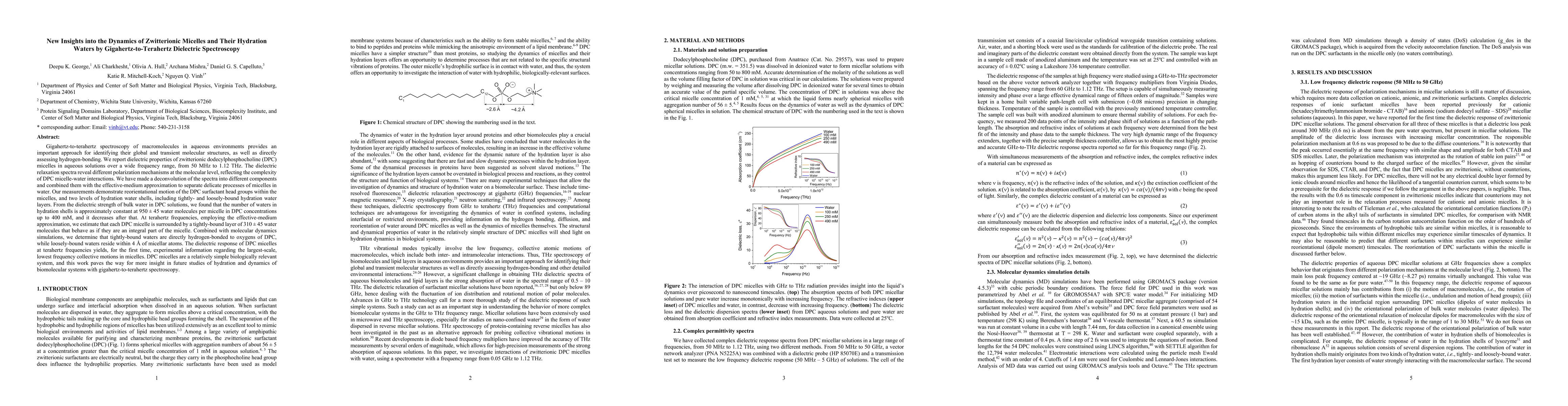 This paper uses gigahertz-to-terahertz dielectric spectroscopy to investigate zwitterionic dodecylphosphocholine (DPC) micelle dynamics and hydration water interactions. The study reveals distinct polarization mechanisms and identifies two hydration water layers, with tightly-bound waters directly hydrogen-bonded to DPC oxygens.
