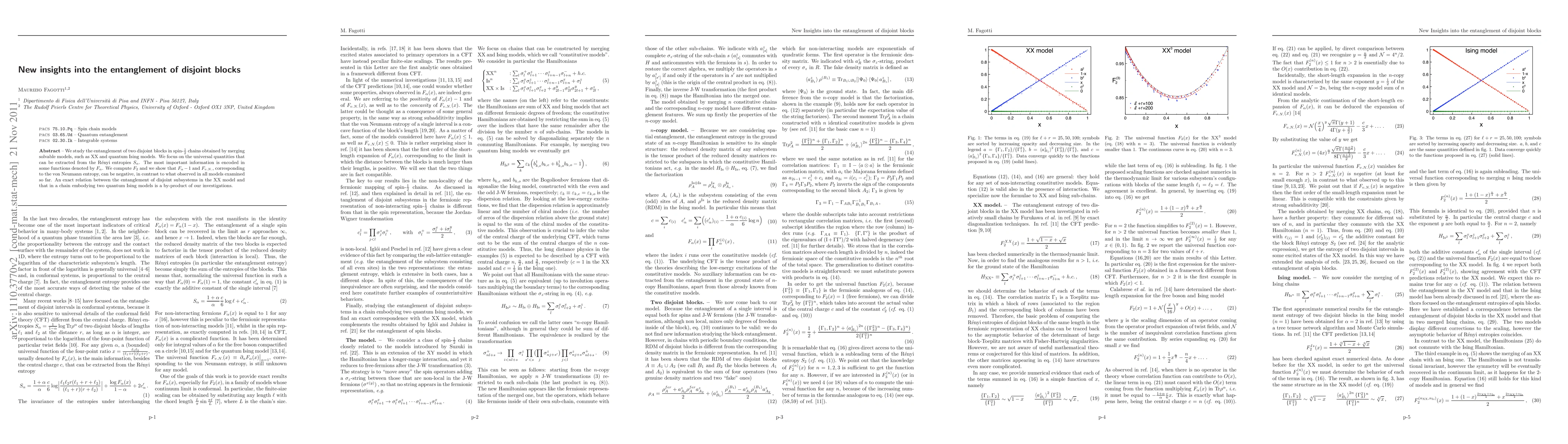 This paper investigates the entanglement of two disjoint blocks in spin-1/2 chains derived from solvable models like the XX and quantum Ising models, revealing that certain universal quantities, specifically F_\alpha, can be negative, a departure from previous observations. An exact relation between the entanglement in the XX model and a chain with two quantum Ising models is also discovered.