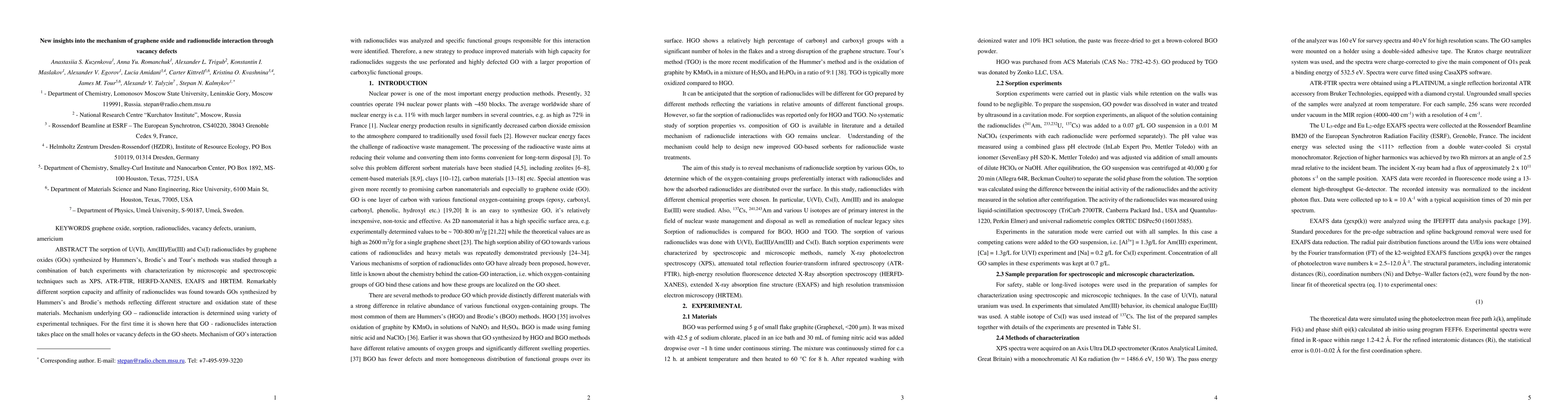 This study investigates the interaction mechanism between graphene oxide and radionuclides via vacancy defects, employing a combination of batch sorption experiments and advanced characterization techniques including XPS, ATR-FTIR, HERFD-XANES, EXAFS, and HRTEM to elucidate the underlying processes.