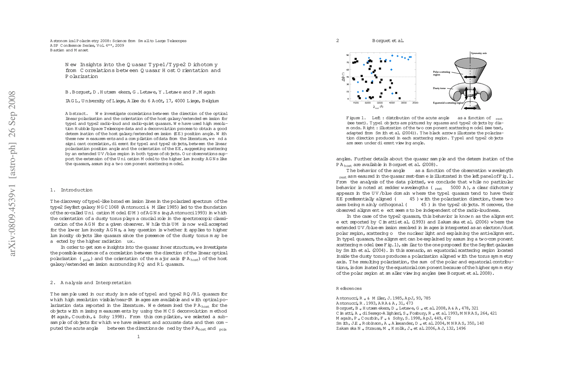 This paper finds significant correlations between the orientation of quasar host galaxies and their optical linear polarization, differing for type1 and type2 quasars, suggesting scattering by an extended UV/blue region. These results support the Unification Model for quasars, incorporating a two-component scattering mechanism.