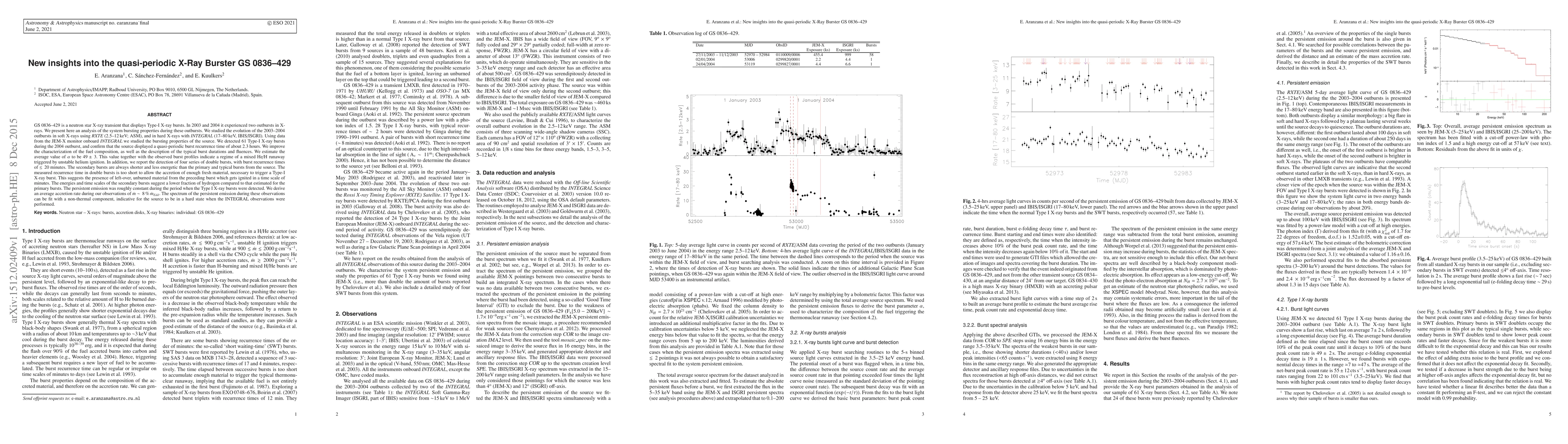 GS 0836-429 is a neutron star X-ray transient that displays Type-I X-ray bursts. In 2003 and 2004 it experienced two outbursts in X-rays. We present here an analysis of the system bursting properties during these outbursts. We studied the evolution of the 2003-2004 outbursts in soft X-rays using RXTE (2.5-12 keV; ASM), and in hard X-rays with INTEGRAL (17-80 keV, IBIS/ISGRI). Using data from the JEM-X monitor onboard INTEGRAL we detected 61 Type-I X-ray bursts, and confirm that the source displayed a quasi-periodic burst recurrence time of about 2.3 hours. We improve the characterization of the fuel composition, as well as the description of the typical burst durations and fluences. We estimate the average value of $\alpha$ to be $49\pm\,3$. This value together with the observed burst profiles indicate a regime of a mixed He/H runaway triggered by unstable helium ignition. In addition, we report the detection of four series of double bursts, with burst recurrence times of $\leq\,20$ minutes. The measured recurrence time in double bursts is too short to allow the accretion of enough fresh material, necessary to trigger a Type-I X-ray burst. This suggests the presence of left-over, unburned material from the preceding burst which gets ignited in a time scale of minutes. The energies and time scales of the secondary bursts suggest a lower fraction of hydrogen compared to that estimated for the primary bursts. The persistent emission was roughly constant during the period when the Type I X-ray bursts were detected. We derive an average accretion rate during our observations of $\dot{m}\sim\,8\,\%\,\dot{m}_{Edd}$. The spectrum of the persistent emission can be fit with a non-thermal component, indicative for the source to be in a hard state when the INTEGRAL observations were performed.