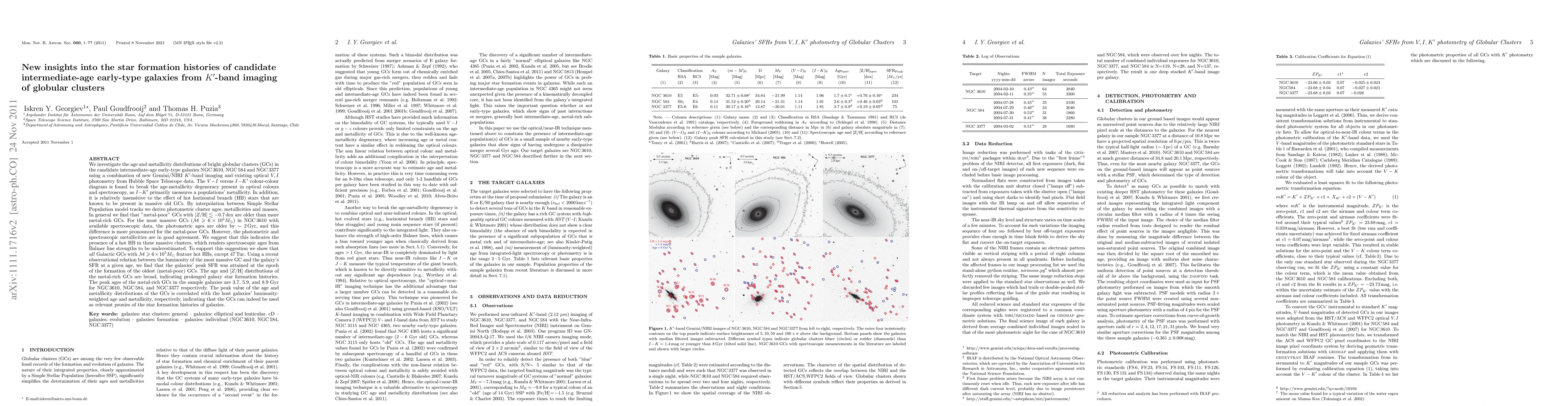 We investigate age and metallicity distributions of bright globular clusters (GCs) in the candidate intermediate-age early-type galaxies NGC 3610, NGC 584 and NGC 3377 using a combination of new Gemini/NIRI K'-band imaging and existing optical V,I photometry from HST data. The V-I vs I-K' colour-colour diagram is found to break the age-metallicity degeneracy present in optical colours, as I-K' primarily measures a populations' metallicity and is relatively insensitive, unlike optical spectroscopy, to the effect of hot horizontal branch (HB) stars, known to be present in massive old GCs. We derive GCs' photometric age, Z and masses. In general, metal-poor ([Z/H]<-0.7dex) GCs are older than more metal-rich GCs. For the most massive GCs (M>6x10^5 M_sol) in NGC 3610 with available spectroscopic data, photometric ages are older by ~2 Gyr, and this difference is more pronounced for the metal-poor GCs. However, photometric and spectroscopic metallicities are in good agreement. We suggest that this indicates the presence of a hot HB in these massive clusters, which renders spectroscopic ages from Balmer line strengths to be underestimated. To support this suggestion we show that all Galactic GCs with M>6x10^5 M_sol feature hot HBs, except 47 Tuc. Using the relation between the most massive GC mass and the galaxy's SFR, we find that the galaxies' peak SFR was attained at the epoch of the formation of the oldest (metal-poor) GCs. Age and [Z/H] distributions of the metal-rich GCs are broad, indicating prolonged galaxy star formation histories. The peak value of the age and [Z/H] distributions of the GCs correlates with host galaxy integrated age and [Z/H], showing that GCs can indeed be used as relevant proxies of the star formation histories of galaxies.(Abridged)