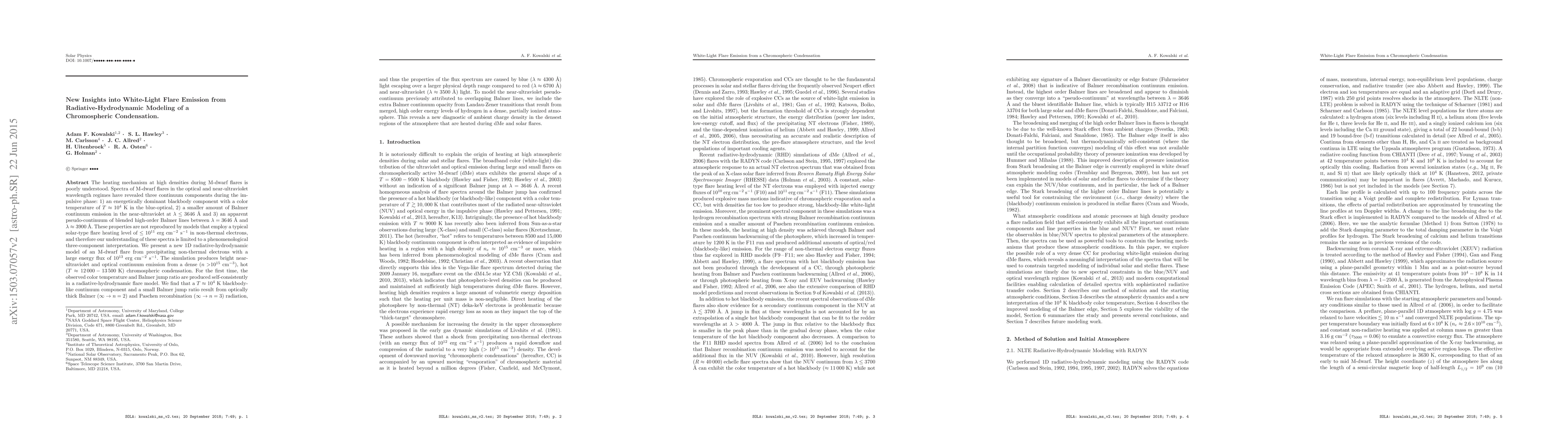 This paper presents a new 1D radiative-hydrodynamic model that successfully reproduces the observed spectral components of M dwarf flares, including a bright continuum emission from a dense chromospheric condensation. The model attributes the observed color temperature and Balmer jump ratio to optically thick Balmer and Paschen recombination radiation, providing new insights into the heating mechanisms during M dwarf flares.