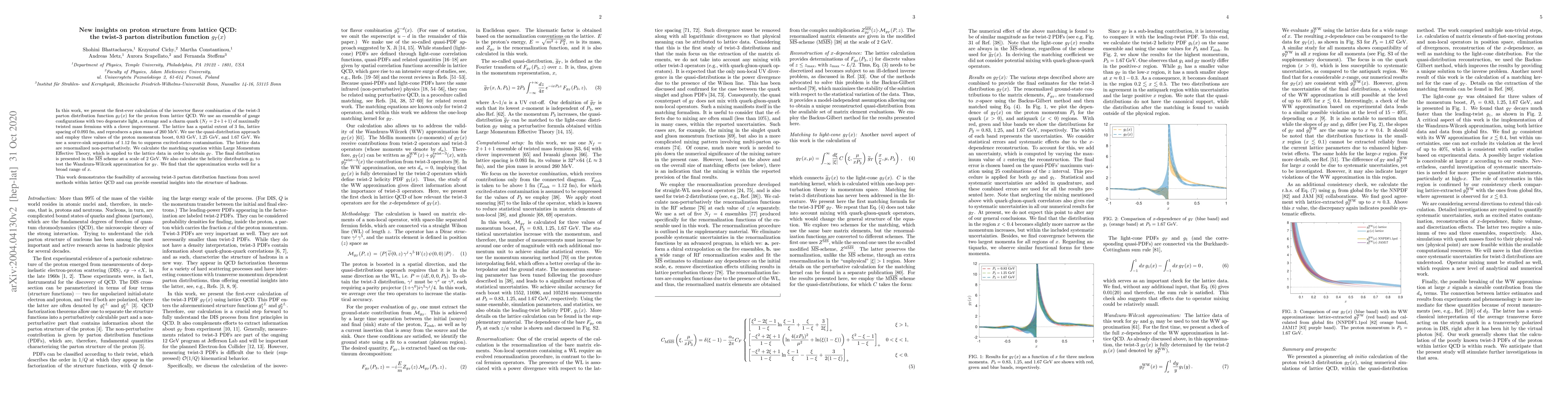 This paper presents the first lattice QCD calculation of the twist-3 parton distribution function $g_T(x)$ for the proton, using a quasi-distribution approach and non-perturbative renormalization. The study also validates the Wandzura-Wilczek approximation for $g_T$ over a wide range of $x$, showcasing the potential of lattice QCD for detailed proton structure analysis.