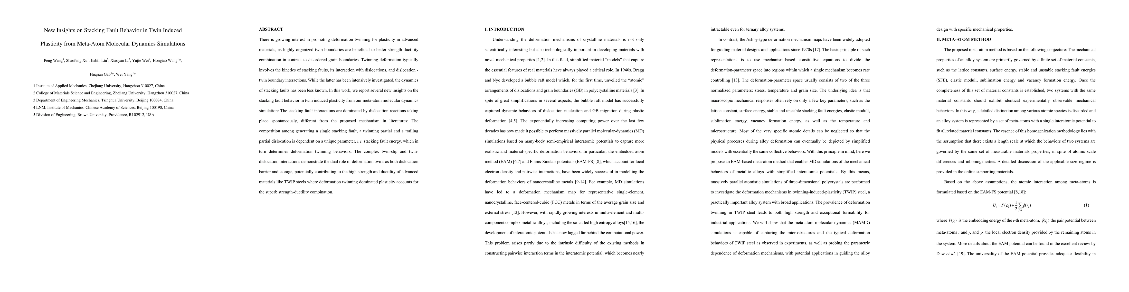 This study reveals new insights into stacking fault behavior in twin-induced plasticity through meta-atom molecular dynamics simulations, showing that stacking fault interactions are driven by spontaneous dislocation reactions, and that the competition among stacking faults, twinning partials, and trailing partials hinges on stacking fault energy, influencing deformation twinning and the strength-ductility balance in advanced materials.