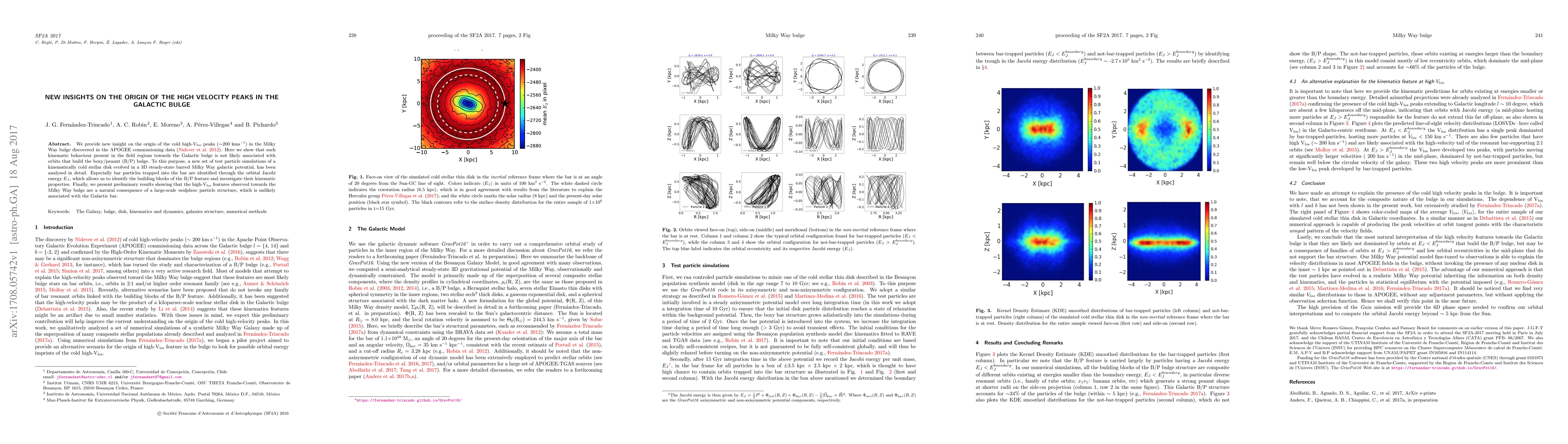 We provide new insight on the origin of the cold high-V$_{\rm los}$ peaks ($\sim$200 kms$^{-1}$) in the Milky Way bulge discovered in the APOGEE commissioning data \citep{Nidever2012}. Here we show that such kinematic behaviour present in the field regions towards the Galactic bulge is not likely associated with orbits that build the boxy/peanut (B/P) bulge. To this purpose, a new set of test particle simulations of a kinematically cold stellar disk evolved in a 3D steady-state barred Milky Way galactic potential, has been analysed in detail. Especially bar particles trapped into the bar are identified through the orbital Jacobi energy $E_{J}$, which allows us to identify the building blocks of the B/P feature and investigate their kinematic properties. Finally, we present preliminary results showing that the high-V$_{\rm los}$ features observed towards the Milky Way bulge are a natural consequence of a large-scale \textit{midplane} particle structure, which is unlikely associated with the Galactic bar.