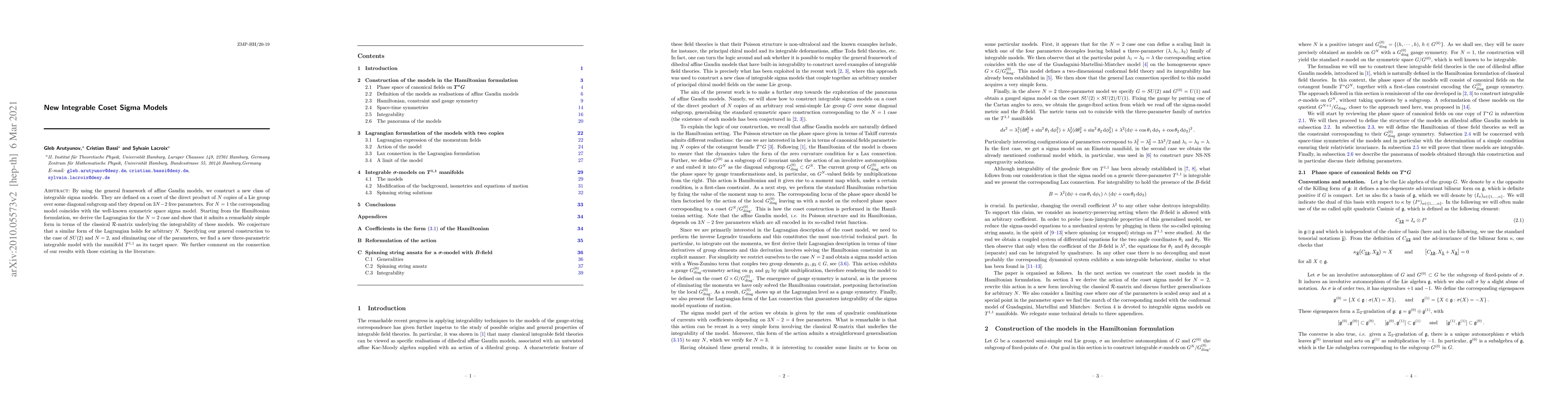 This paper constructs a new class of integrable sigma models based on affine Gaudin models, defined on coset spaces of $N$ copies of a Lie group. For $N=2$, it derives a Lagrangian with a simple form linked to the classical $\mathcal{R}$-matrix, and finds a new three-parametric integrable model with $T^{1,1}$ as its target space.