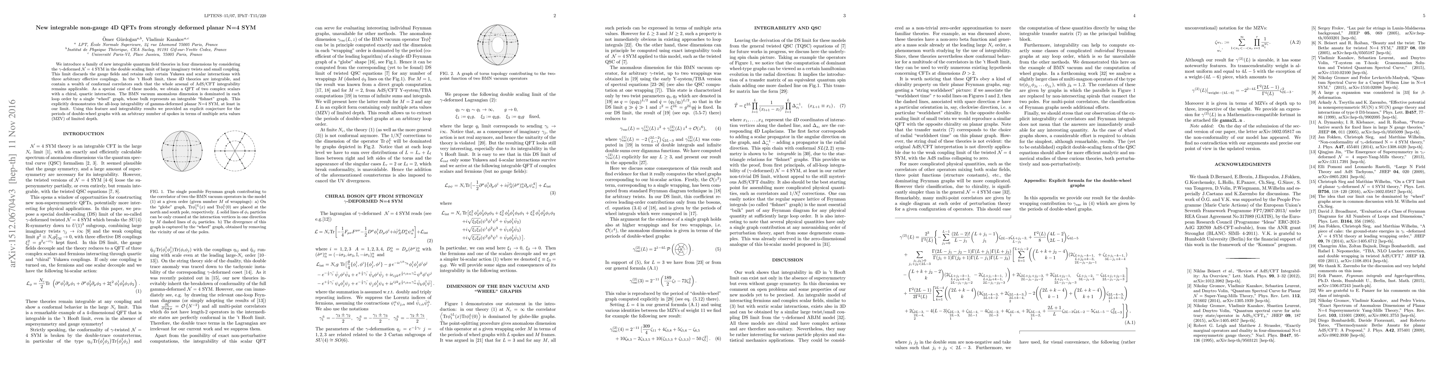 We consider the $\gamma$-deformed $\mathcal{N}=4$ SYM in the double scaling limit of large imaginary twists and small coupling, which discards the gauge fields and retains only certain Yukawa and scalar interactions with three arbitrary effective couplings. In the 't~Hooft limit, these 4D theories are integrable, with most of the correlators being conformal such that the whole arsenal of AdS/CFT integrability remains applicable. In particular, for one non-zero effective coupling, we obtain a QFT of two complex scalars with a chiral, quartic interaction. The BMN vacuum anomalous dimension is dominated in each non-zero loop order by a single "wheel" graph, in principle computable by integrability. Thus we also provide an explicit conjecture for the periods of double-wheel graphs with an arbitrary number of spokes.