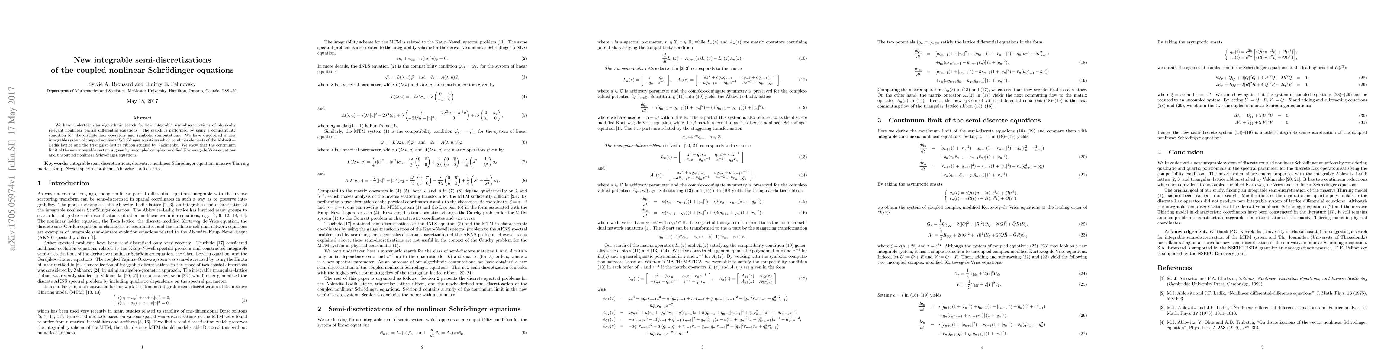 We have undertaken an algorithmic search for new integrable semi-discretizations of physically relevant nonlinear partial differential equations. The search is performed by using a compatibility condition for the discrete Lax operators and symbolic computations. We have discovered a new integrable system of coupled nonlinear Schrodinger equations which combines elements of the Ablowitz-Ladik lattice and the triangular-lattice ribbon studied by Vakhnenko. We show that the continuum limit of the new integrable system is given by uncoupled complex modified Korteweg-de Vries equations and uncoupled nonlinear Schrodinger equations.